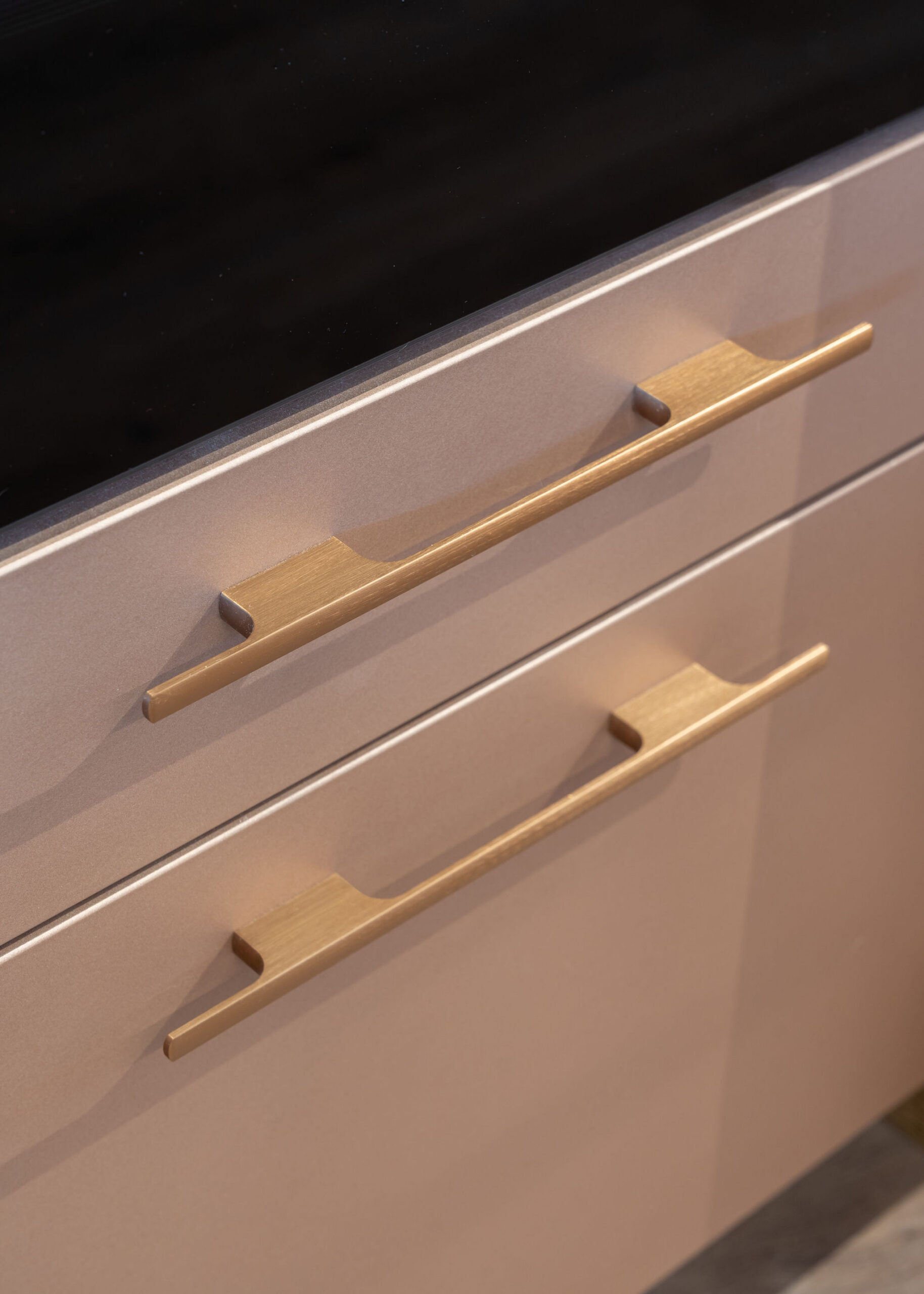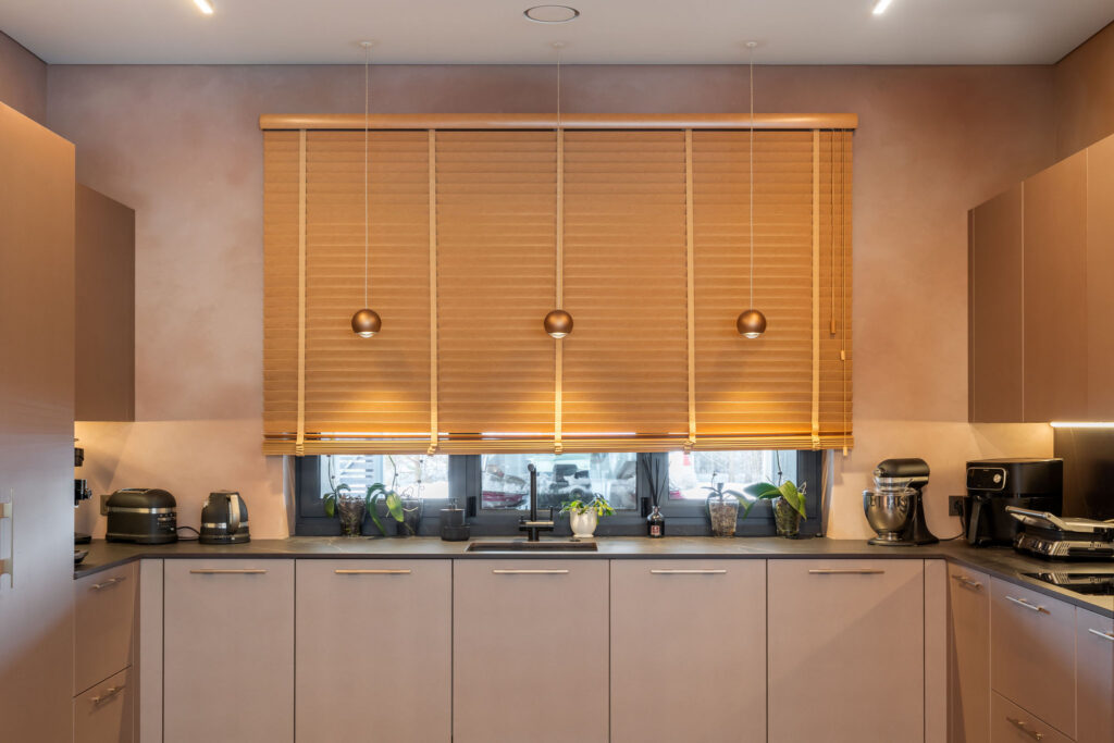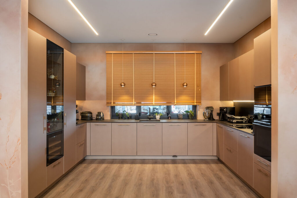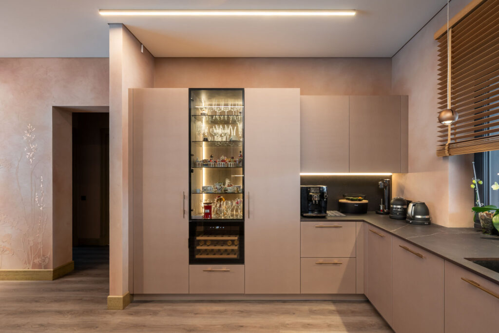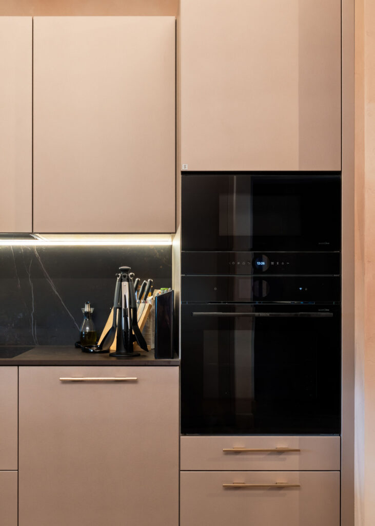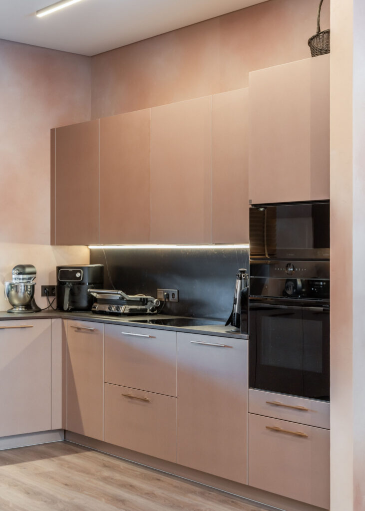 Rõõm on tuua teine üks kaunis projekt, mis on valminud meie Läti kolleegide poolt. Siin on kasutatud värvitud uksi värvitoonis Iron Blush. Töötasapinnaks ja taustaks on mööbli ustega imekaunilt sulanduv Dekton Kelya. Köögile lisab efekti elegantne klaasustega püstak ning kuldsed käepidemed.