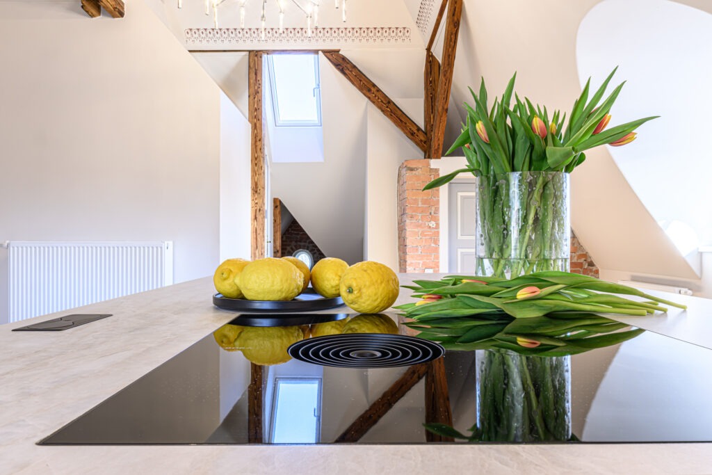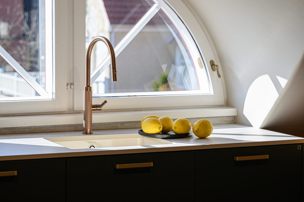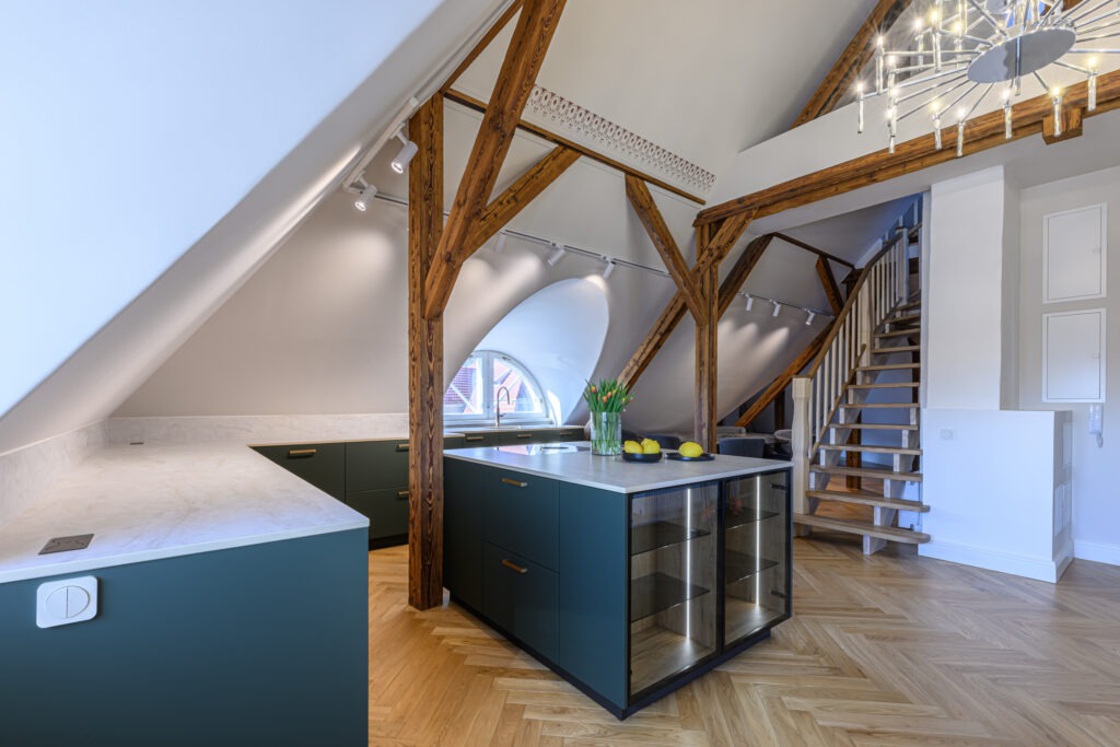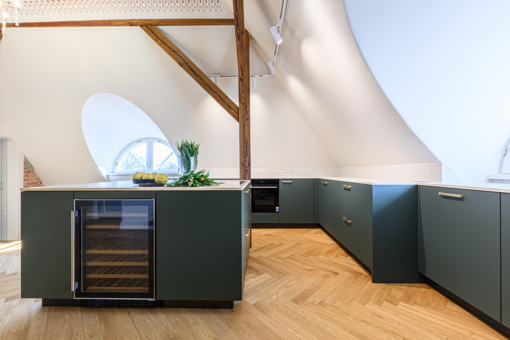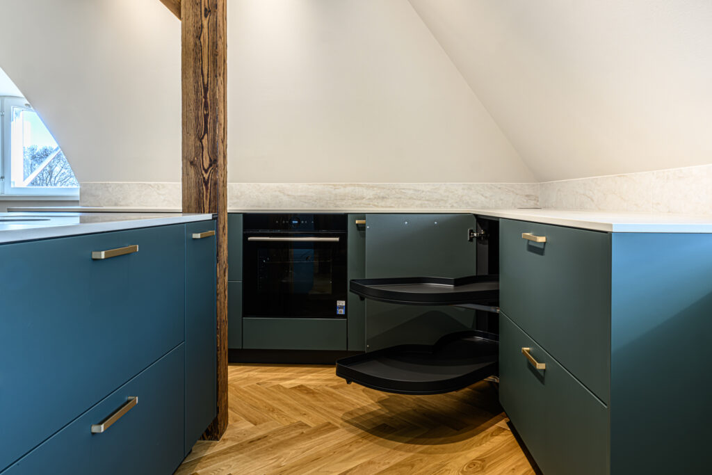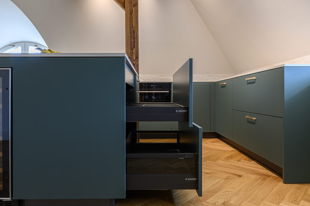 Antud projekt nõudis tänu oma kaldlagedele iga väiksemagi detaili hoolikat planeerimist, et köök oleks praktiline ja pakuks vajalikku hoiustamisruumi. Viimase saavutasime ekstrasügavate sahtlitega, mis lisaks hoiustamisruumile annab juurde ka töötasapinda ja ettevalmistusruumi.