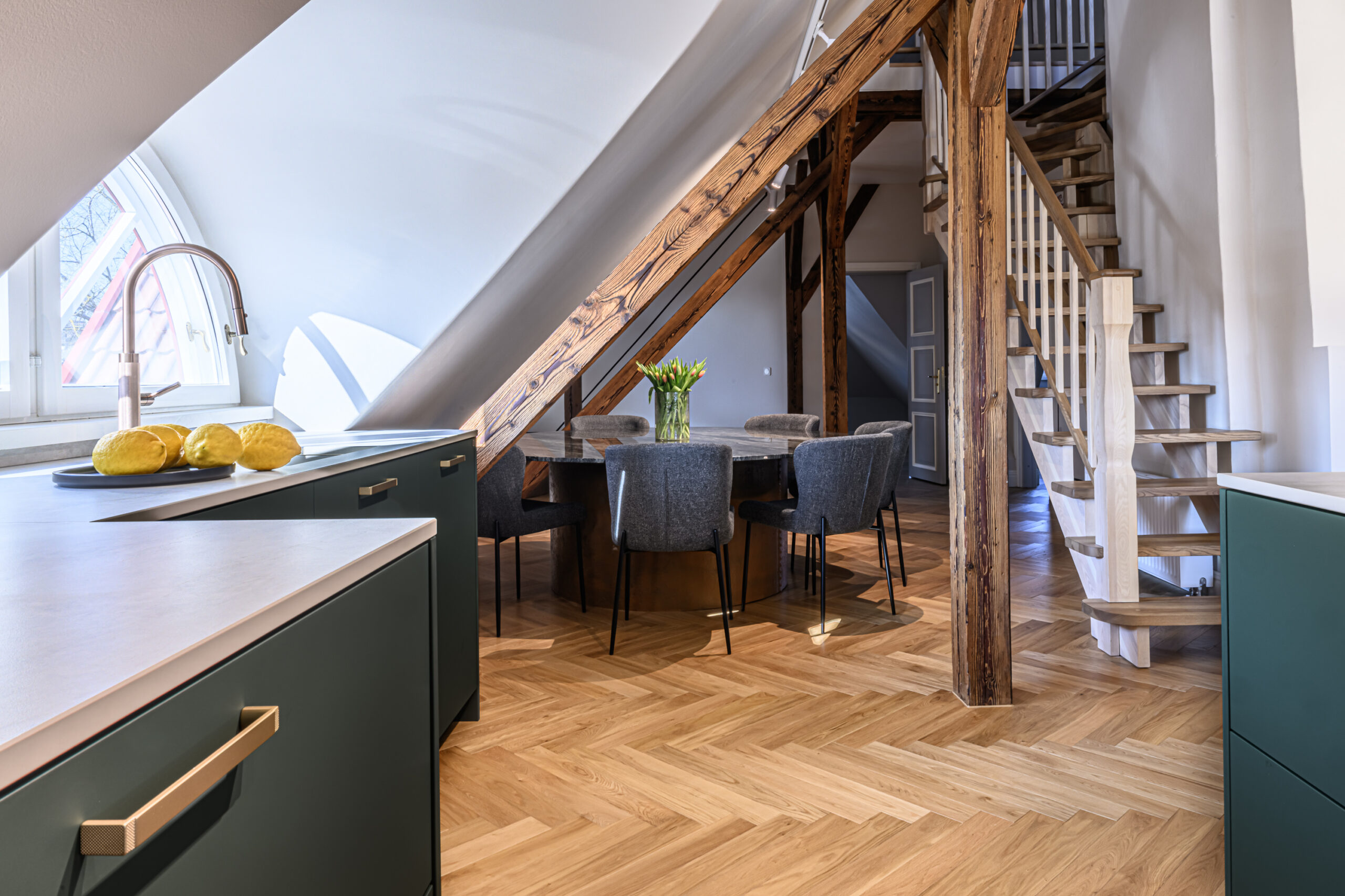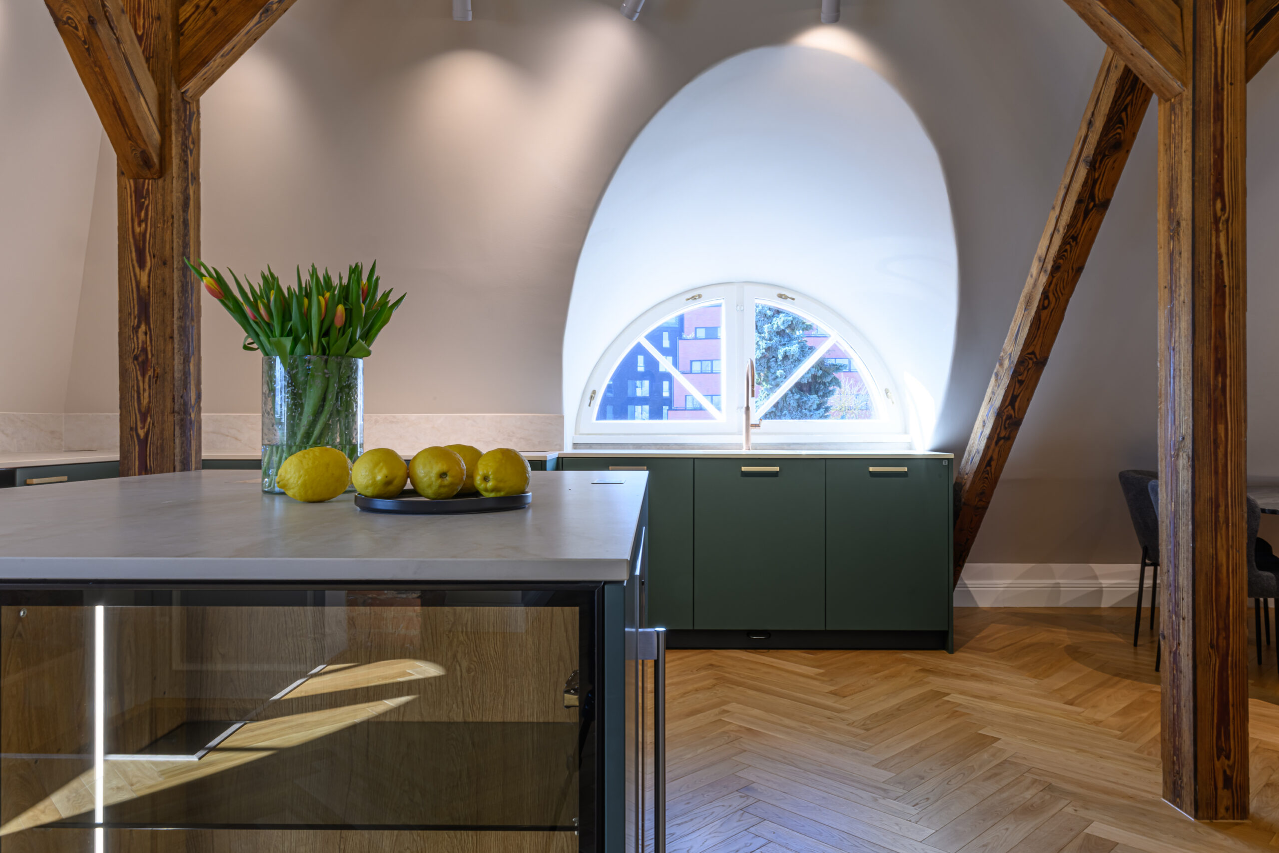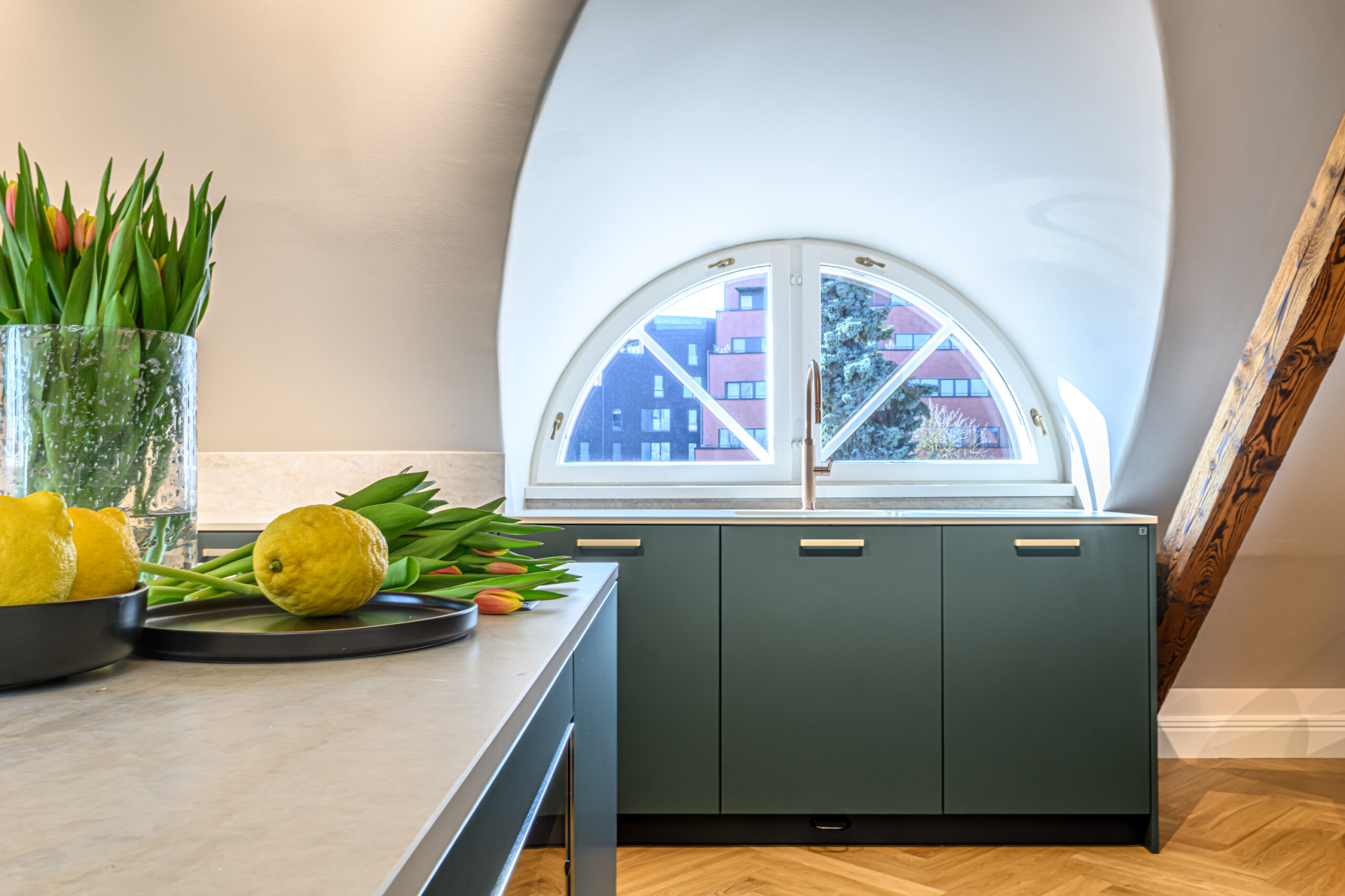 Antud projekt nõudis tänu oma kaldlagedele iga väiksemagi detaili hoolikat planeerimist, et köök oleks praktiline ja pakuks vajalikku hoiustamisruumi. Viimase saavutasime ekstrasügavate sahtlitega, mis lisaks hoiustamisruumile annab juurde ka töötasapinda ja ettevalmistusruumi.