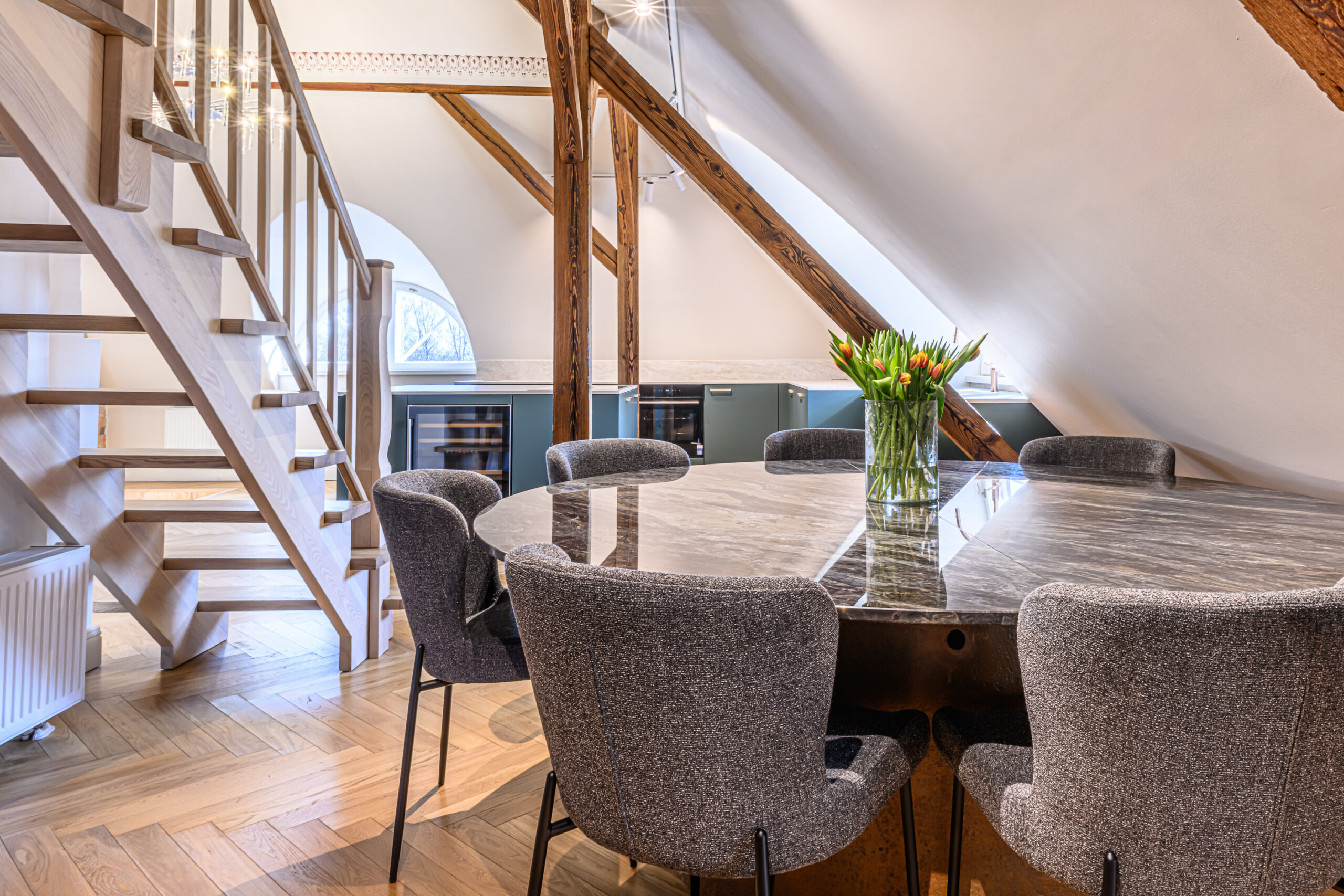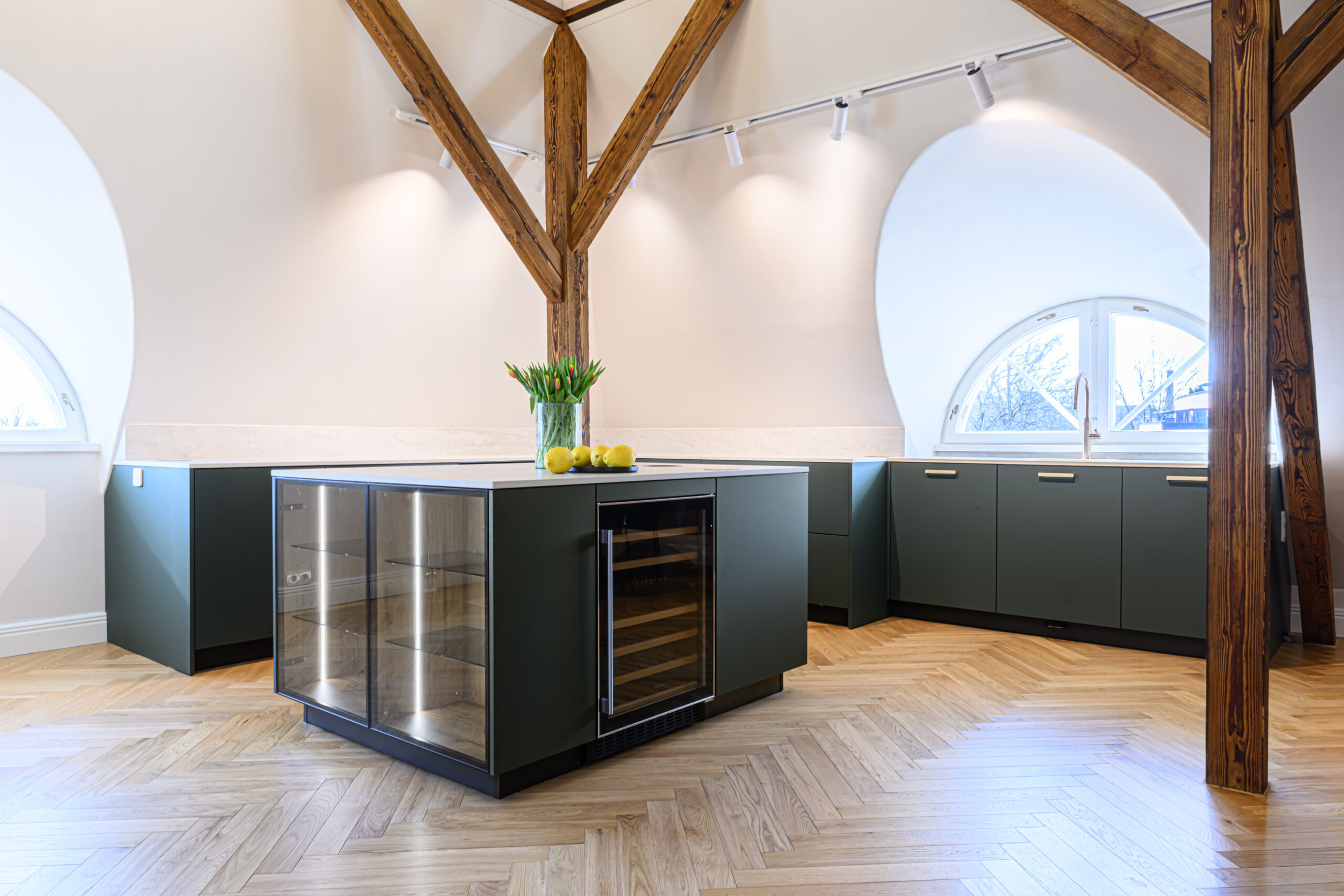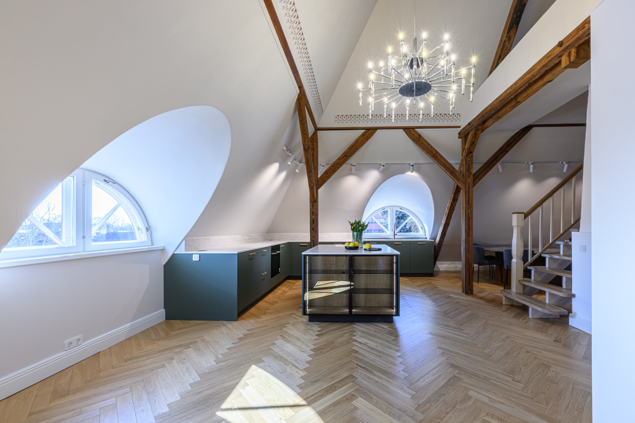 Antud projekt nõudis tänu oma kaldlagedele iga väiksemagi detaili hoolikat planeerimist, et köök oleks praktiline ja pakuks vajalikku hoiustamisruumi. Viimase saavutasime ekstrasügavate sahtlitega, mis lisaks hoiustamisruumile annab juurde ka töötasapinda ja ettevalmistusruumi.