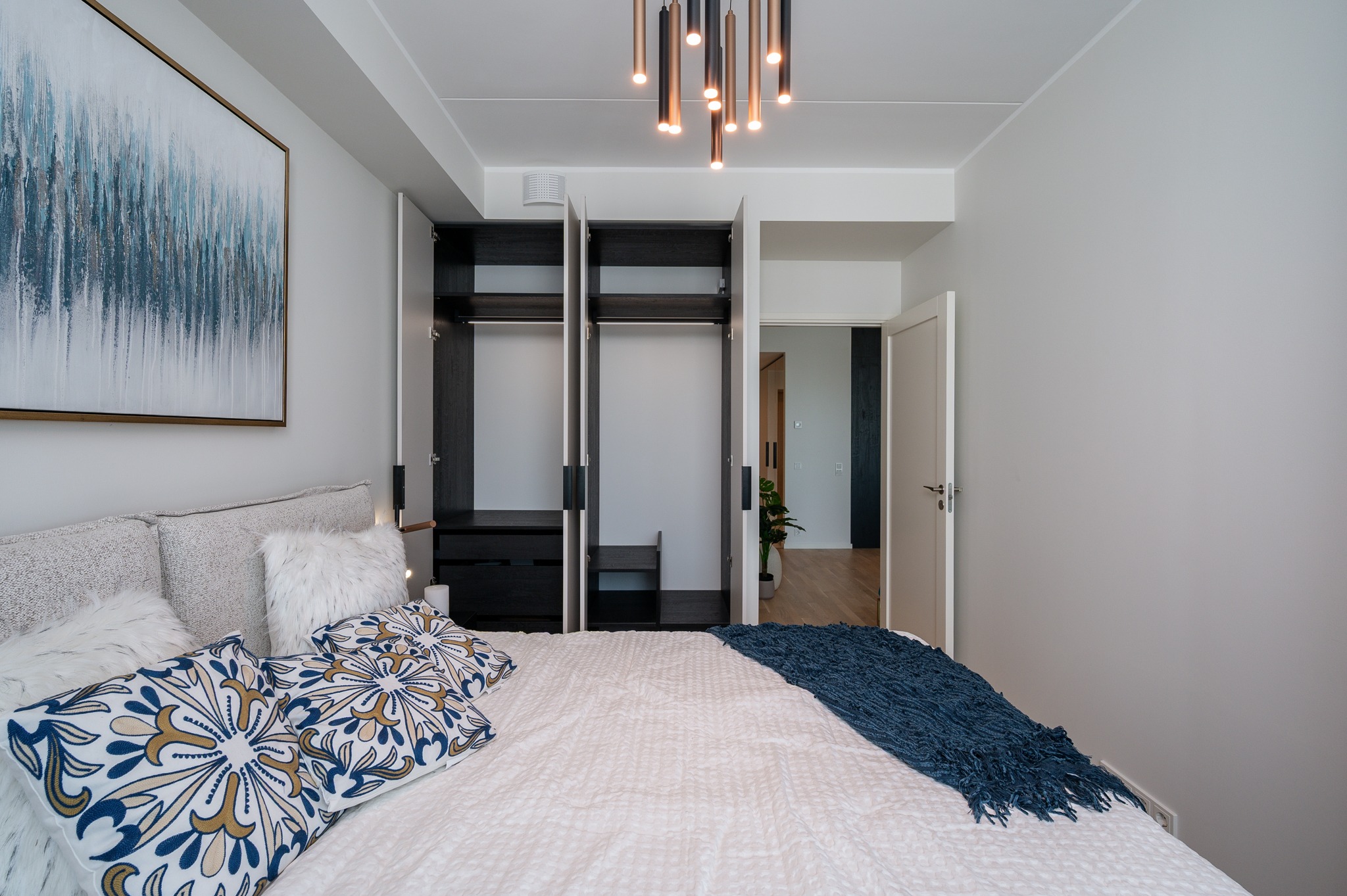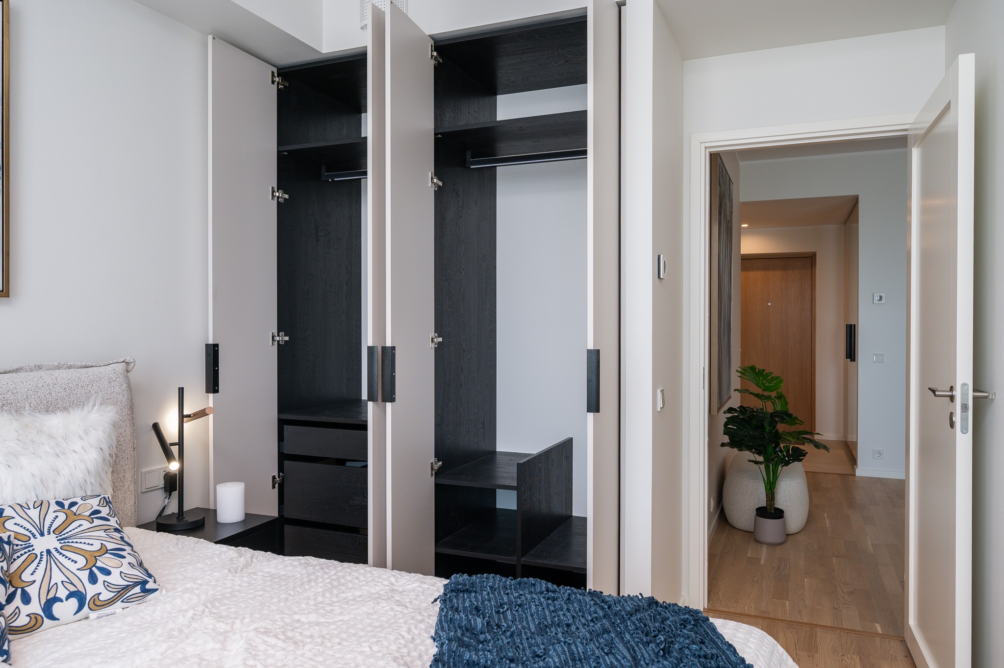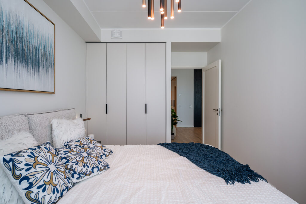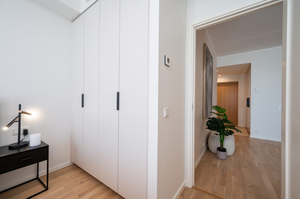 Magamistoa ja esiku gardeboobid ning vannitoa mööbel on kõik tehtud samade materjalide ja värvidega nagu köök – uksed värvitoonis Clay ja sisud musta puiduimitatsiooniga Osaka. Garderoobide lahenduste puhul avanevad käänduksed mugavalt kõrvale ning kapi sisus näete valgustusega stangesid, mis hakkavad tööle uste avanemisel.