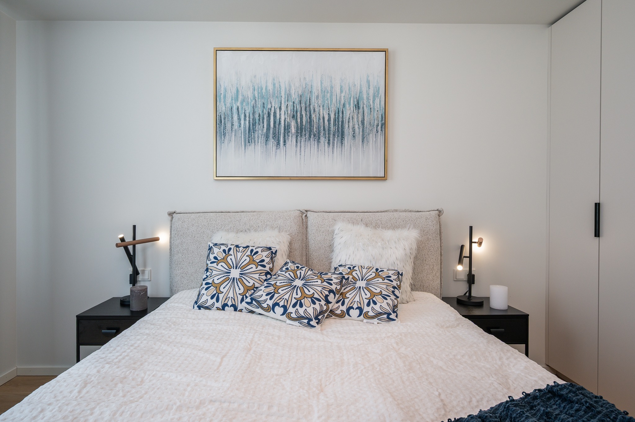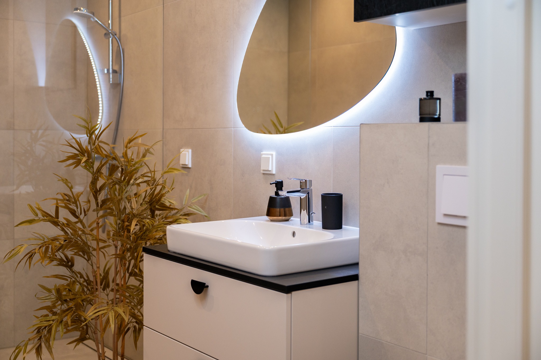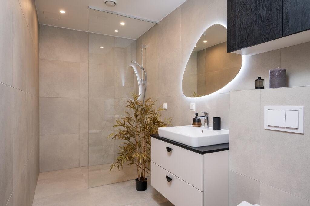 Magamistoa ja esiku gardeboobid ning vannitoa mööbel on kõik tehtud samade materjalide ja värvidega nagu köök – uksed värvitoonis Clay ja sisud musta puiduimitatsiooniga Osaka. Garderoobide lahenduste puhul avanevad käänduksed mugavalt kõrvale ning kapi sisus näete valgustusega stangesid, mis hakkavad tööle uste avanemisel.