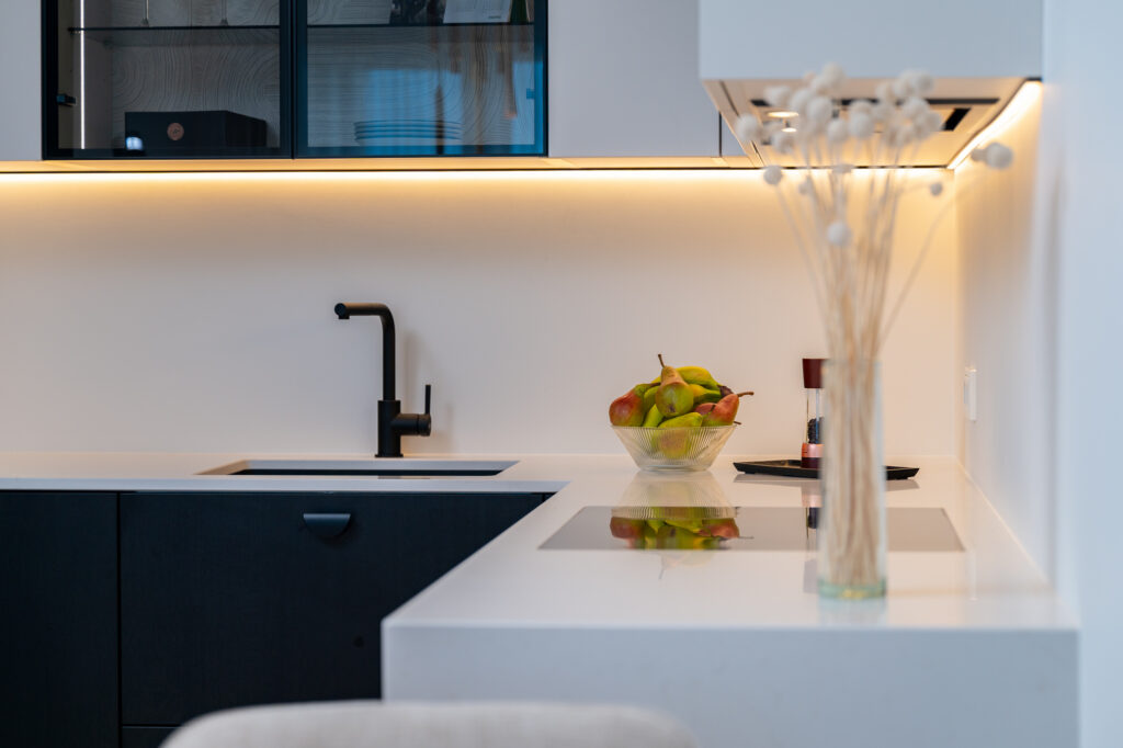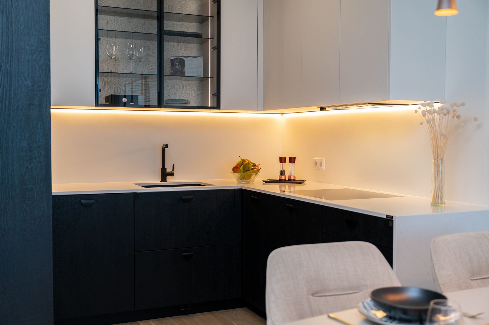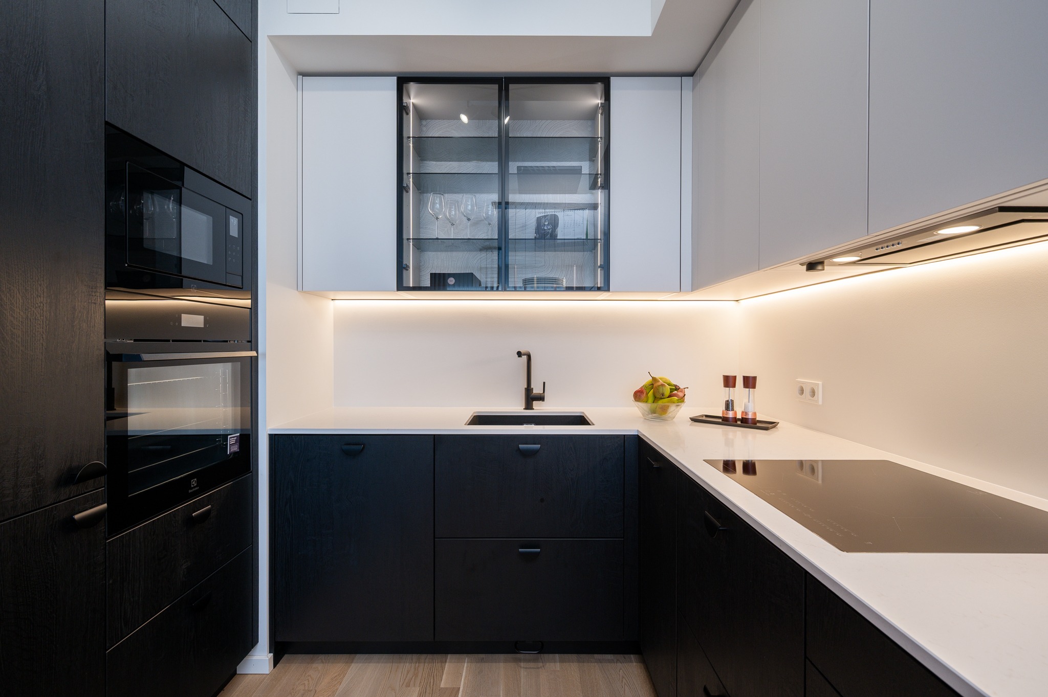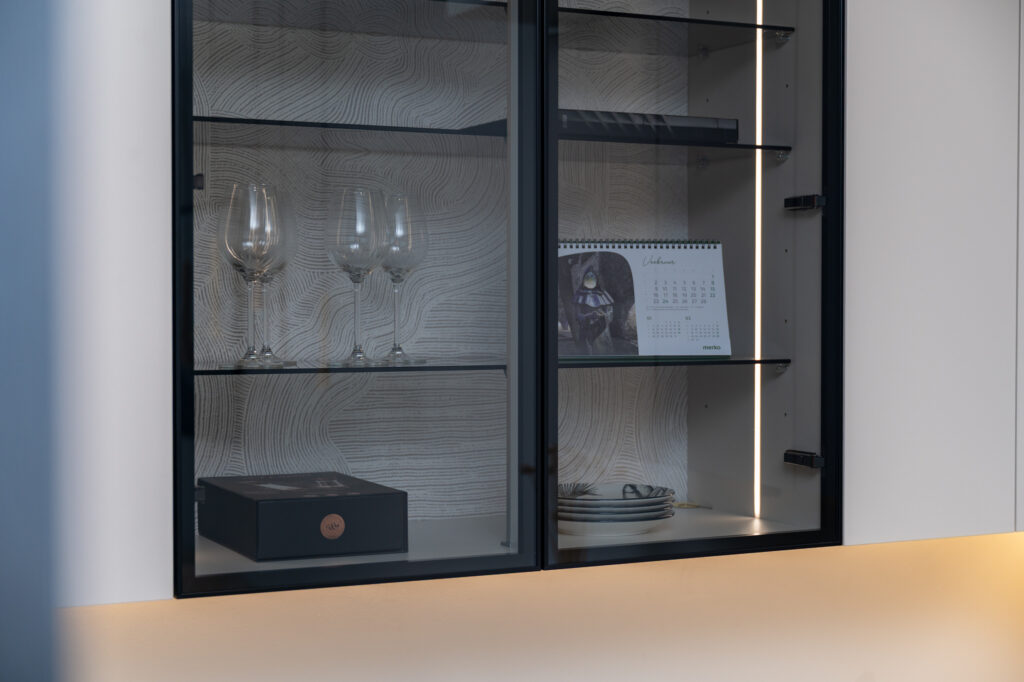 Köögis kasutasime põnevat põletatud puidu efektiga musta materjali Osakat, mis on sobitatud melamiinist ülemiste kappidega värvitoonis Clay. Avarust ja elegantsust lisab valgustusega klaaskapp, kus taustal näete efektset prinditud mustriga paneeli Japanese Garden. Töötasapinnaks on rahuliku disainiga Silestone’i kivi Persian White. Kogu tehnika pärineb Electroluxilt. Alumiste kappide puhul oleme kasutanud standardist sügavamaid sahtleid, mis annavad juurde hoiustamisruumi ja tekitavad lisa tööpinda.