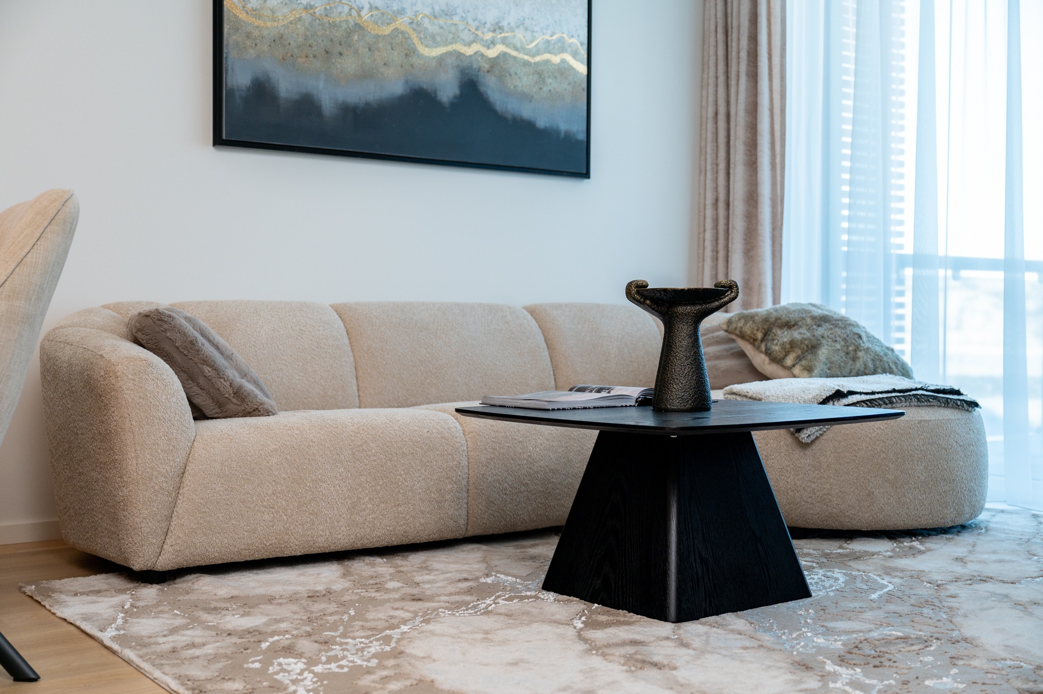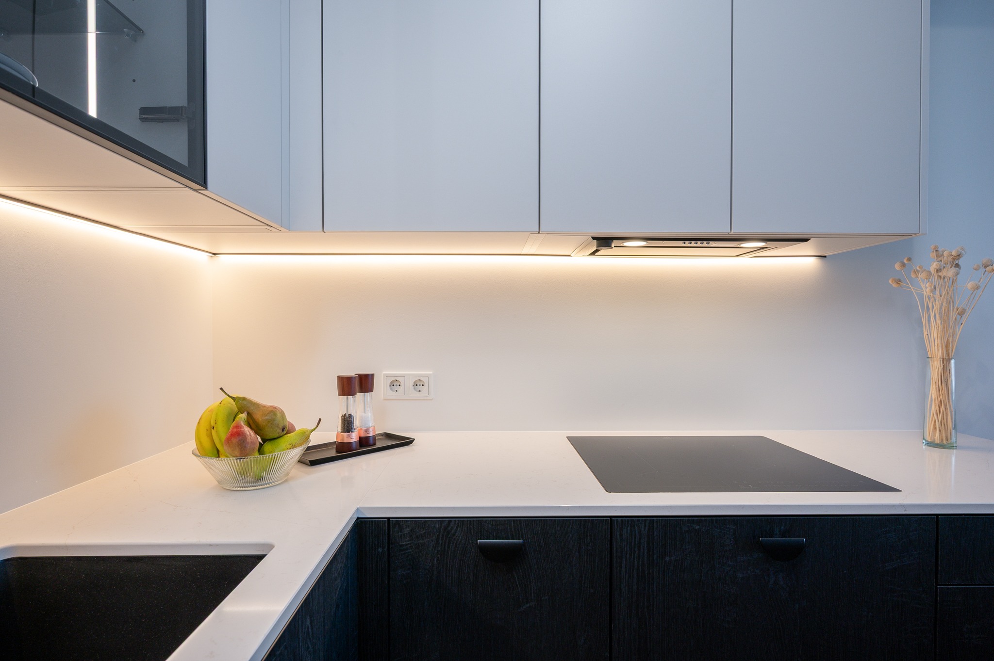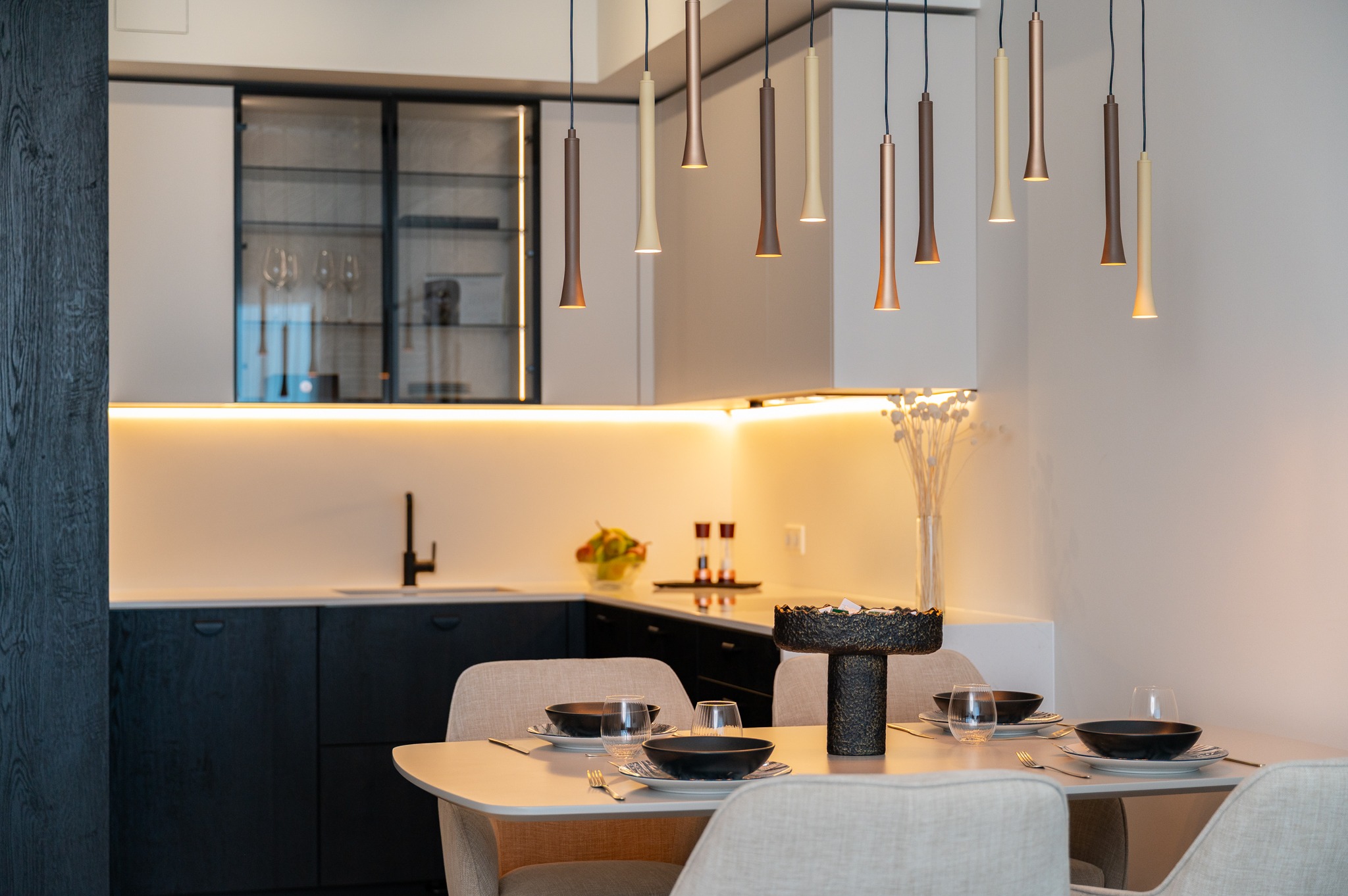 Köögis kasutasime põnevat põletatud puidu efektiga musta materjali Osakat, mis on sobitatud melamiinist ülemiste kappidega värvitoonis Clay. Avarust ja elegantsust lisab valgustusega klaaskapp, kus taustal näete efektset prinditud mustriga paneeli Japanese Garden. Töötasapinnaks on rahuliku disainiga Silestone’i kivi Persian White. Kogu tehnika pärineb Electroluxilt. Alumiste kappide puhul oleme kasutanud standardist sügavamaid sahtleid, mis annavad juurde hoiustamisruumi ja tekitavad lisa tööpinda.
