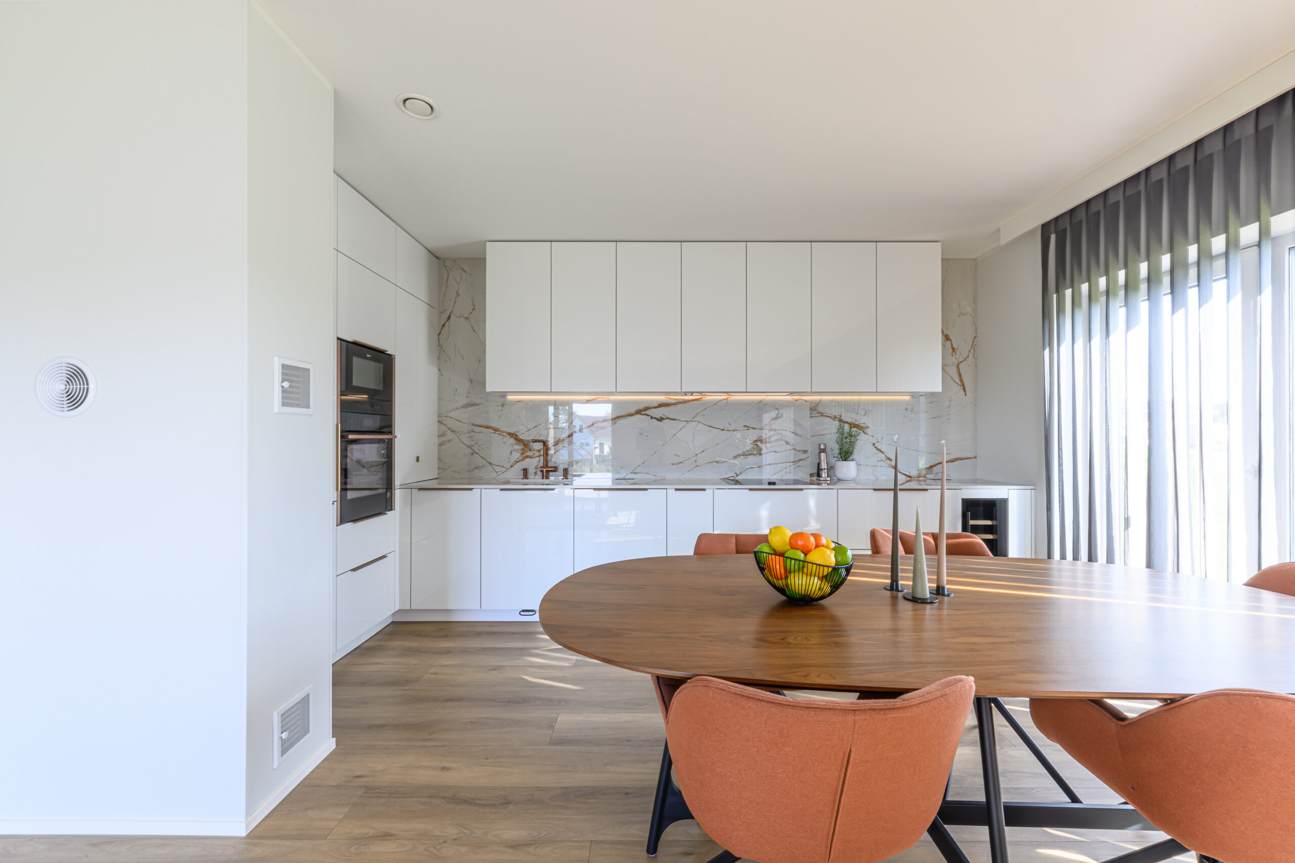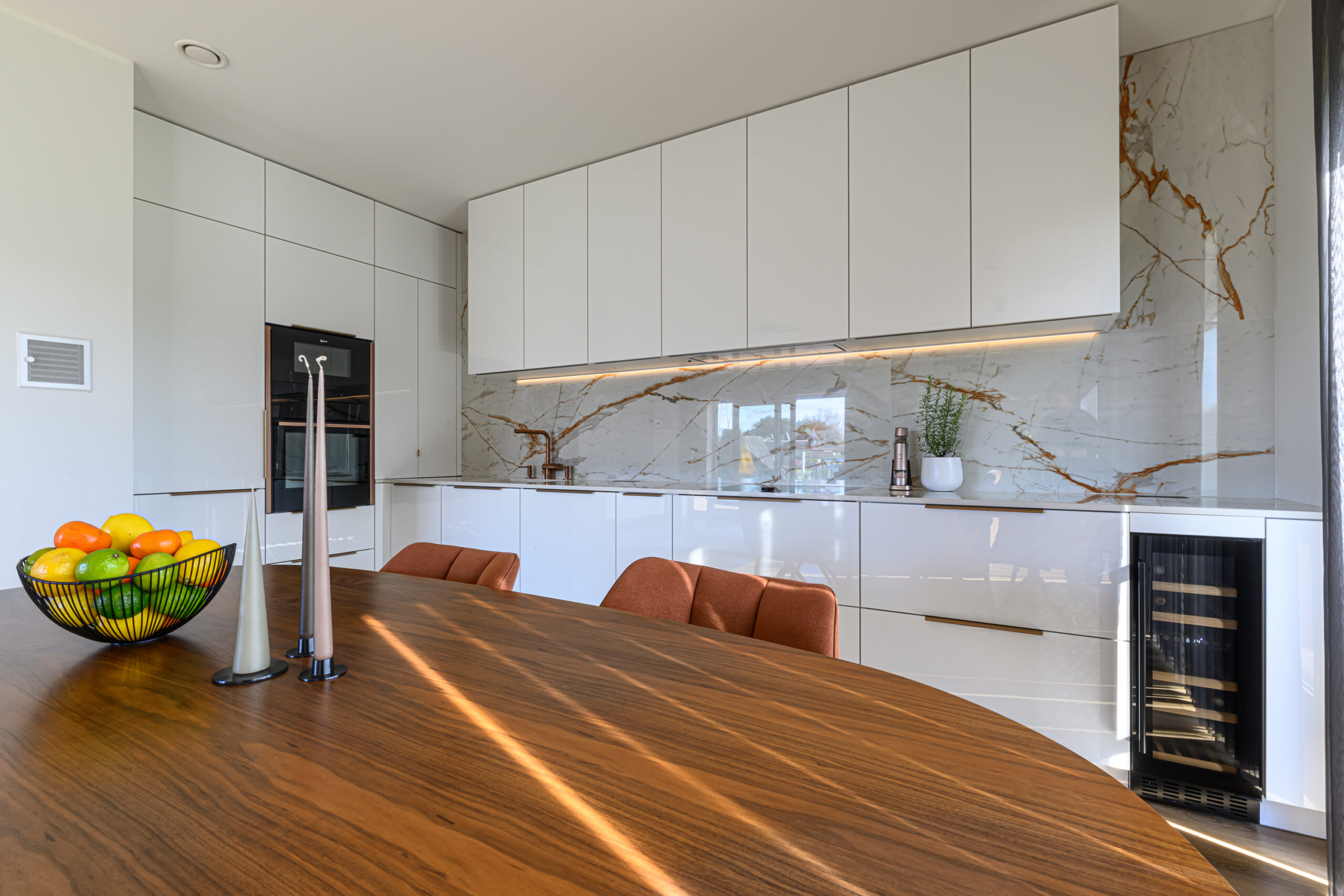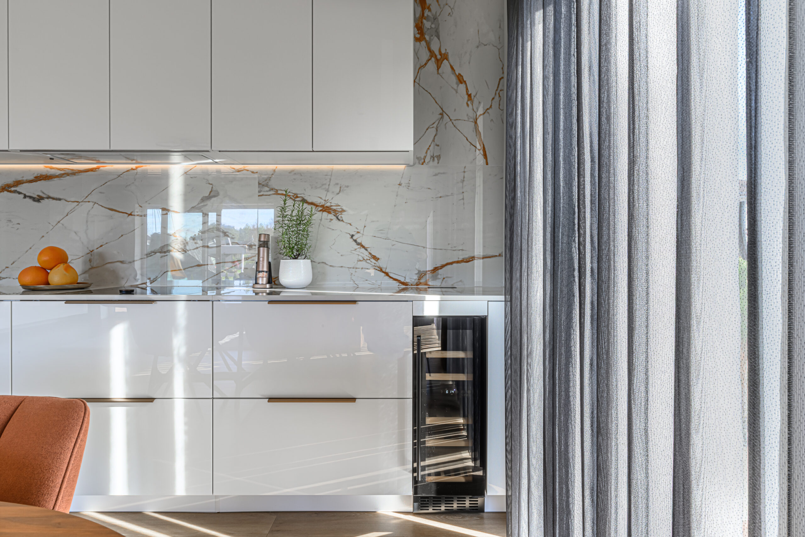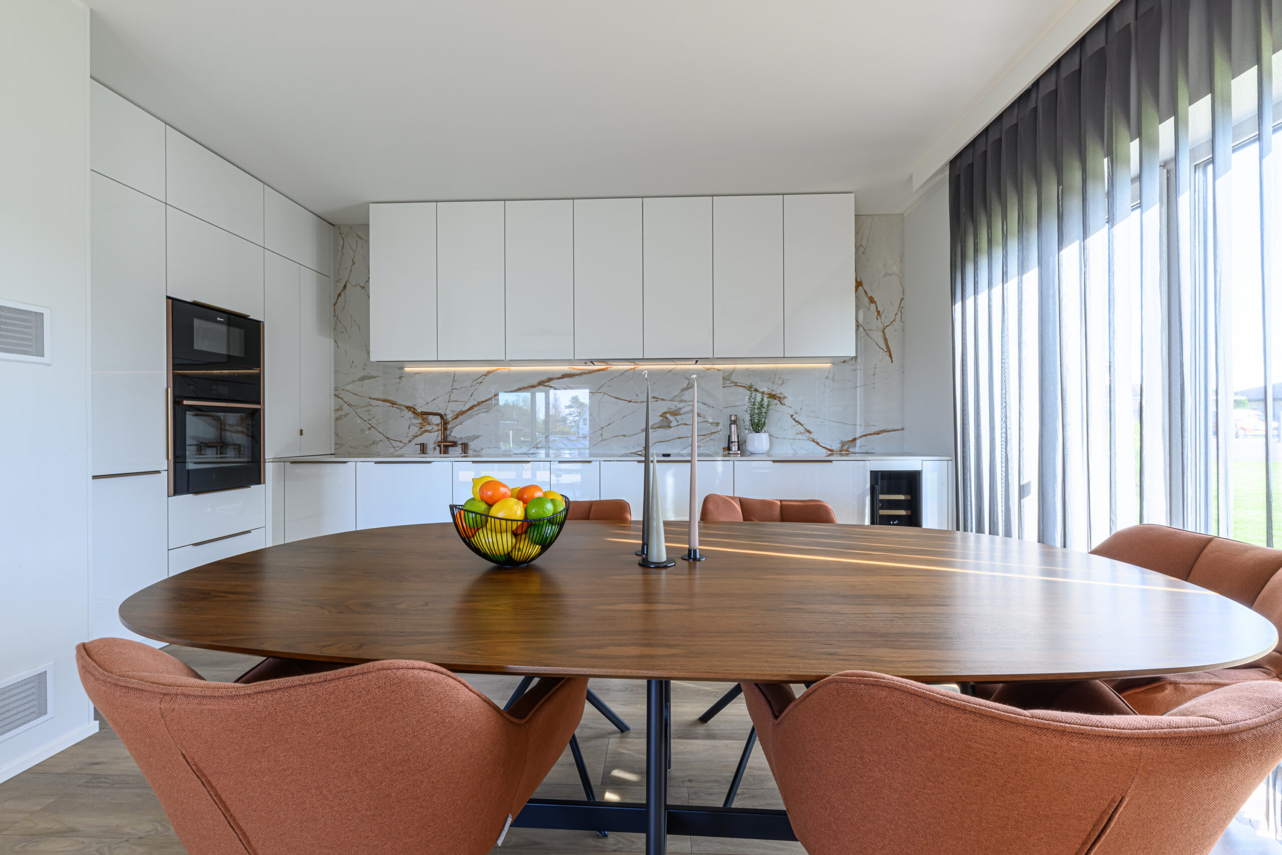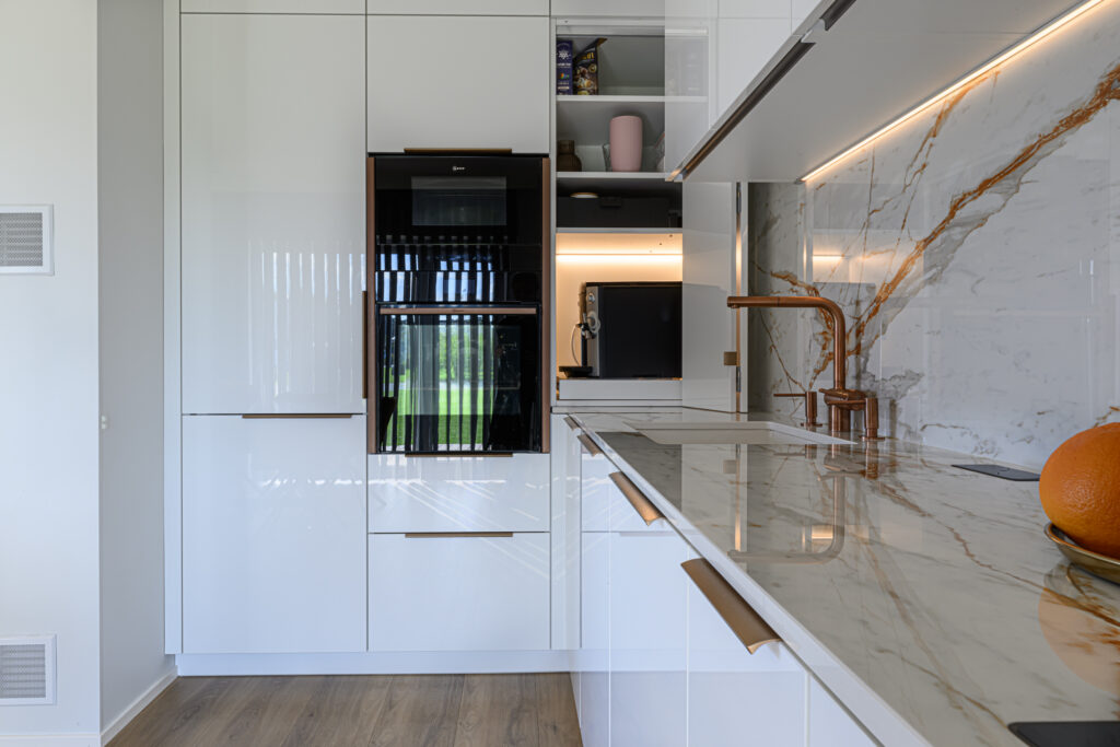 Siin näete ühte armast kodu Viljandimaal, kuhu valmistasime heledates värvitoonides köögi ja TV-kapi lahenduse. Kuna tegemist on avatud elutoaga, siis kasutasime nii köögis kui ka TV-kapi lahenduses valget kõrgläiket, mis loob kauni ühtse tulemuse. Köögi töötasapinnaks on jõuliste veenidega Dekton Awake kivi Cosentinolt. Ruumi viimistlevad kaunilt üheks tervikuks pronksjad detailid – käepidemed, ahju liistud ja sanitaartehnika. Tehnikasett on valitud Saksa tootjalt Neffilt. Kivi värvitoonidest inspireerituna on sarnastes värvides tellitud ka Riviera Maisoni toolid ja Dan-Formi laud, mida saab samuti tellida Schmidtist. Kuna kodu omanikud on suured kokkajad, on iga detail köögis hoolikalt läbi mõeldus, et see oleks võimalikult praktiline ja mugav kasutada.