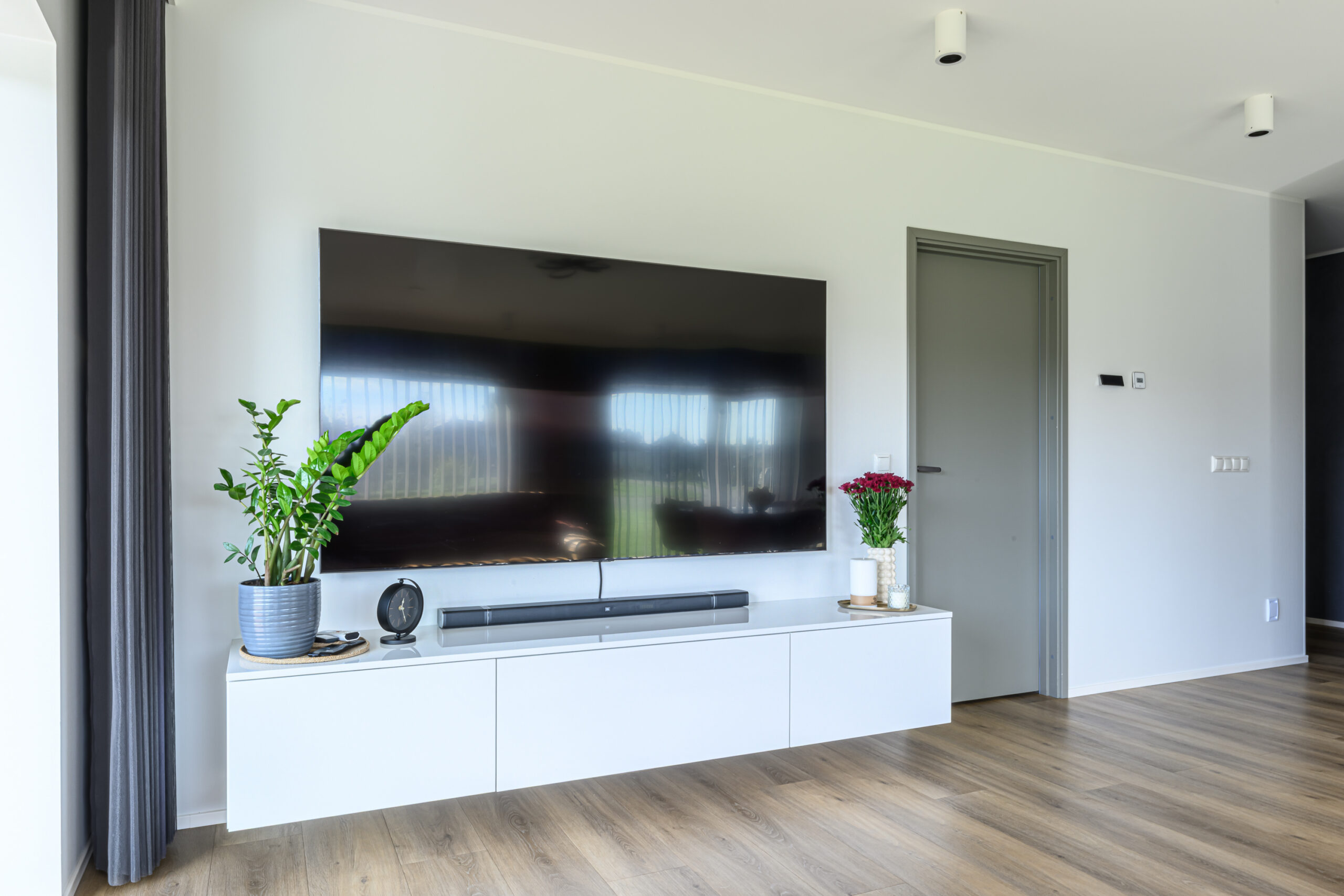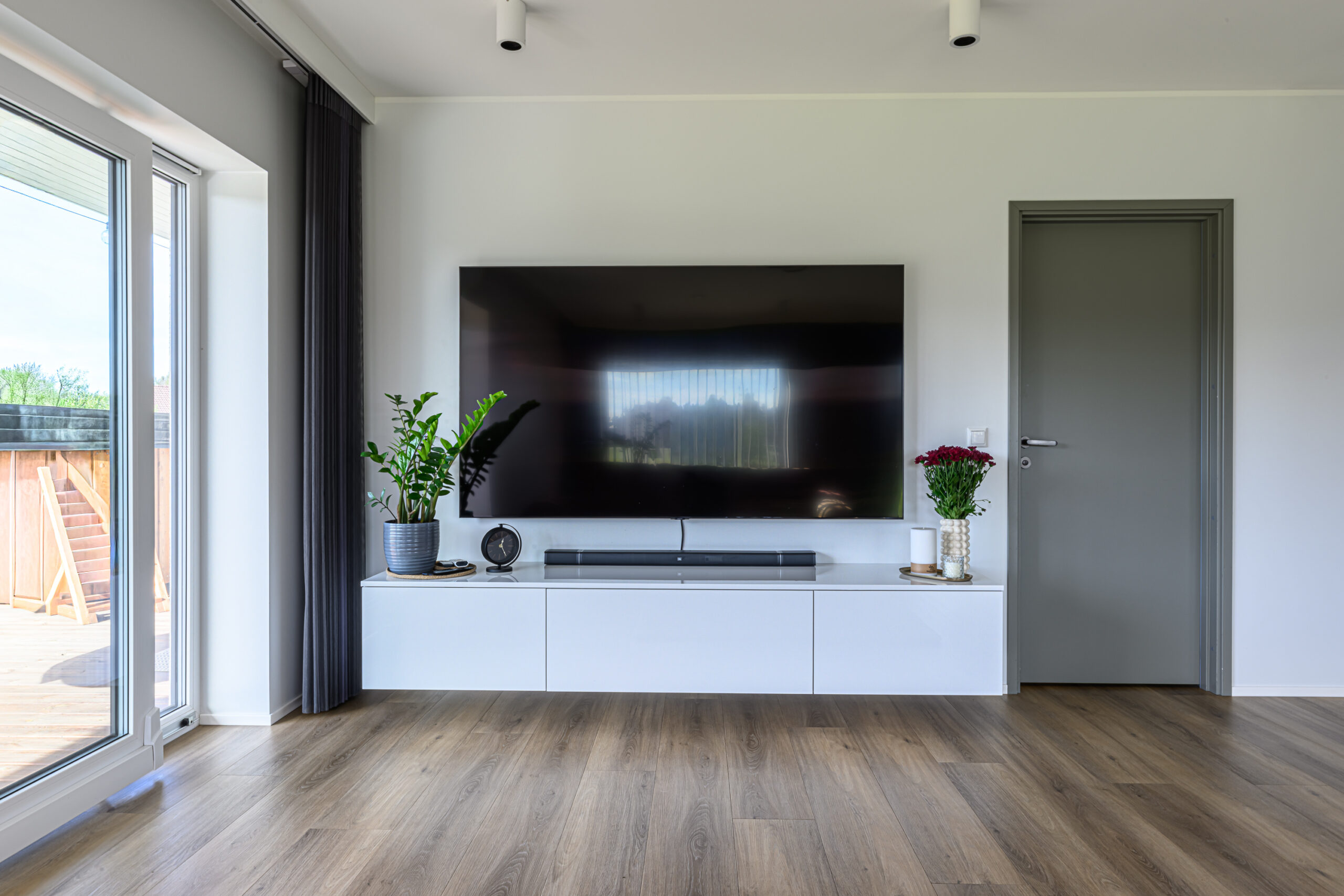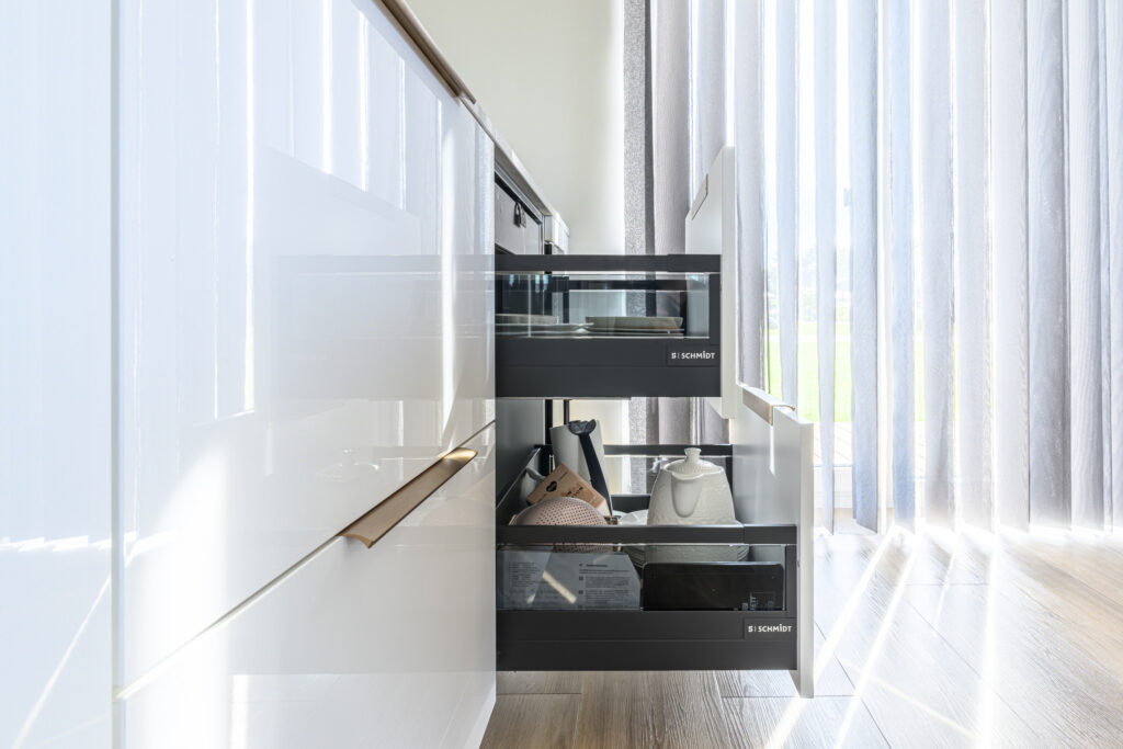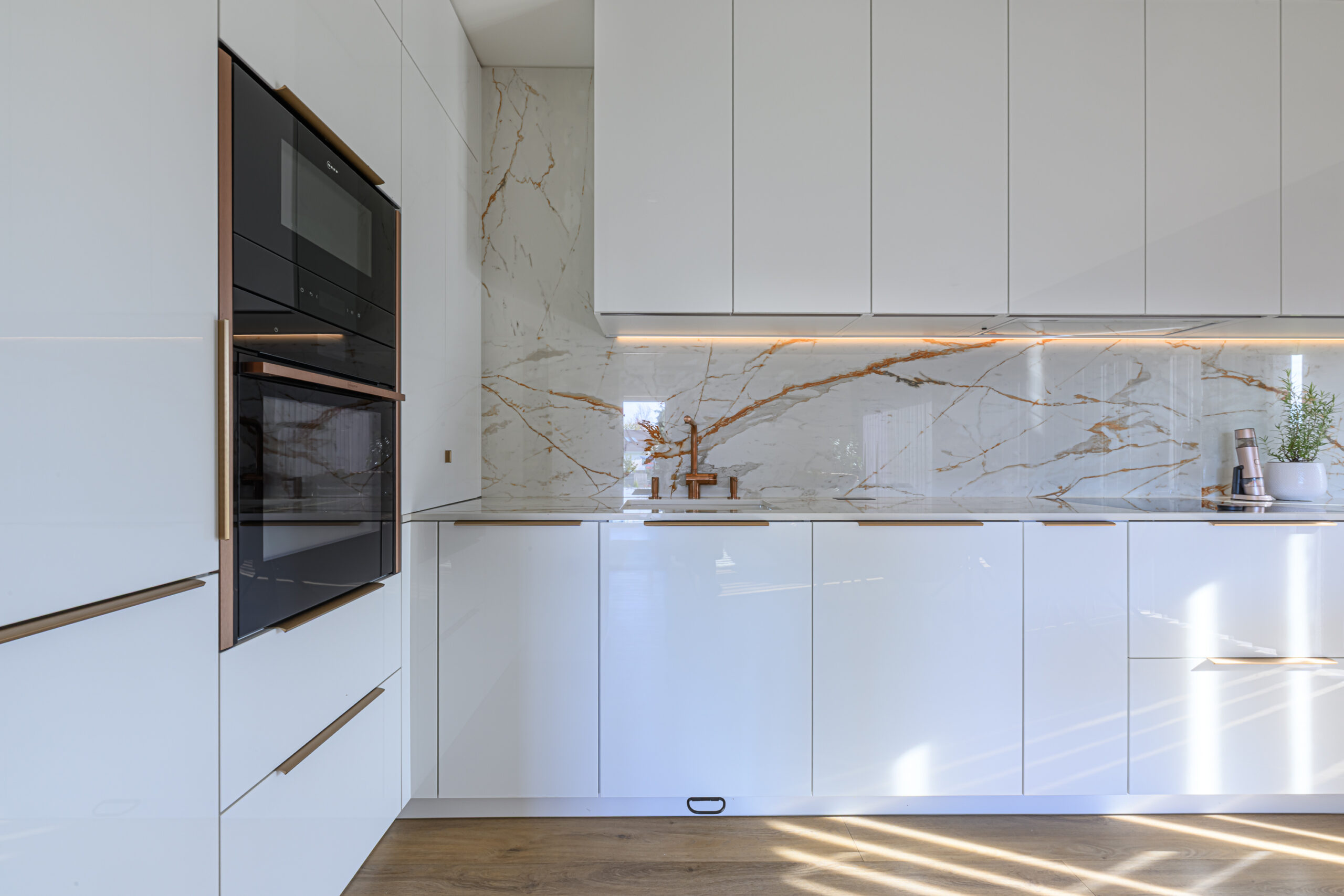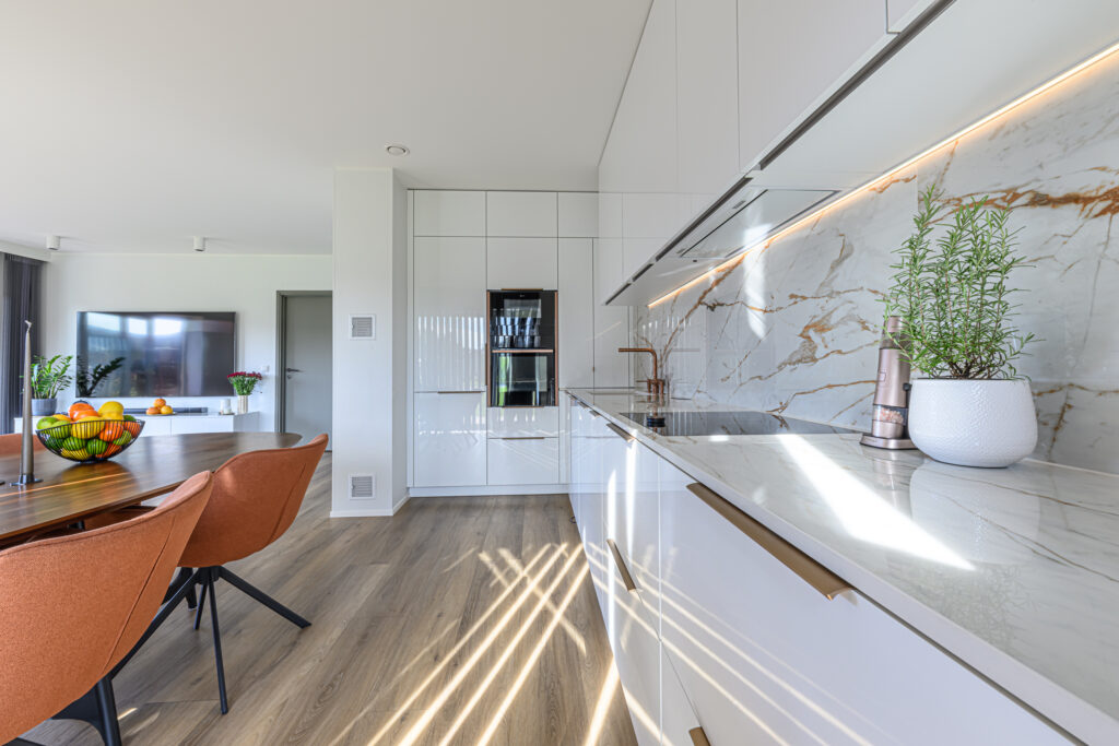 Siin näete ühte armast kodu Viljandimaal, kuhu valmistasime heledates värvitoonides köögi ja TV-kapi lahenduse. Kuna tegemist on avatud elutoaga, siis kasutasime nii köögis kui ka TV-kapi lahenduses valget kõrgläiket, mis loob kauni ühtse tulemuse. Köögi töötasapinnaks on jõuliste veenidega Dekton Awake kivi Cosentinolt. Ruumi viimistlevad kaunilt üheks tervikuks pronksjad detailid – käepidemed, ahju liistud ja sanitaartehnika. Tehnikasett on valitud Saksa tootjalt Neffilt. Kivi värvitoonidest inspireerituna on sarnastes värvides tellitud ka Riviera Maisoni toolid ja Dan-Formi laud, mida saab samuti tellida Schmidtist. Kuna kodu omanikud on suured kokkajad, on iga detail köögis hoolikalt läbi mõeldus, et see oleks võimalikult praktiline ja mugav kasutada.