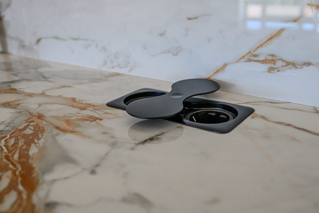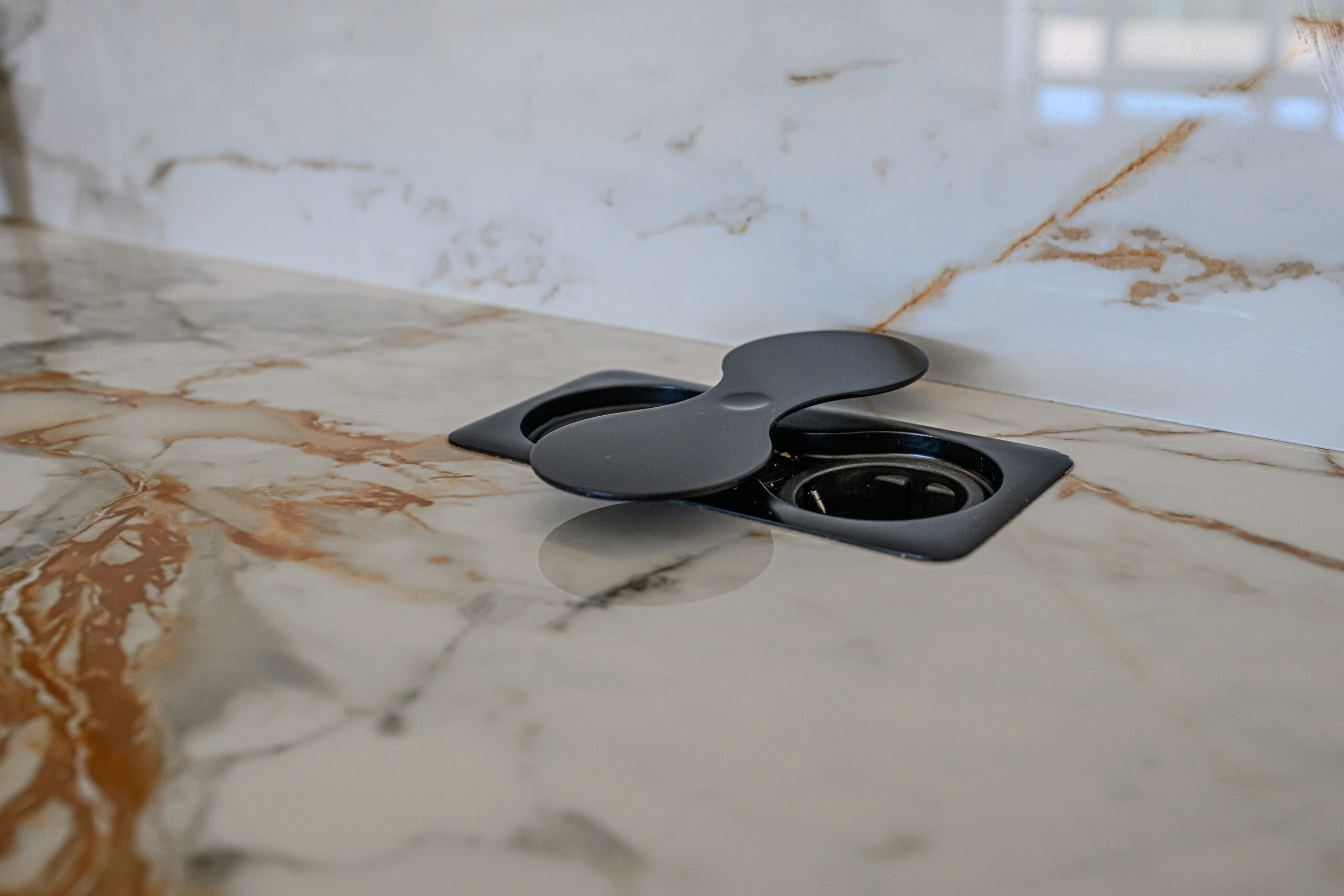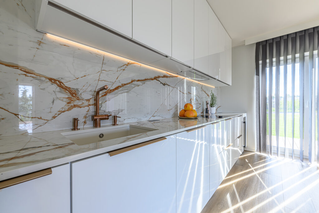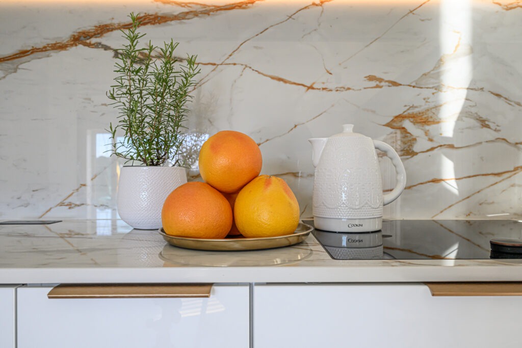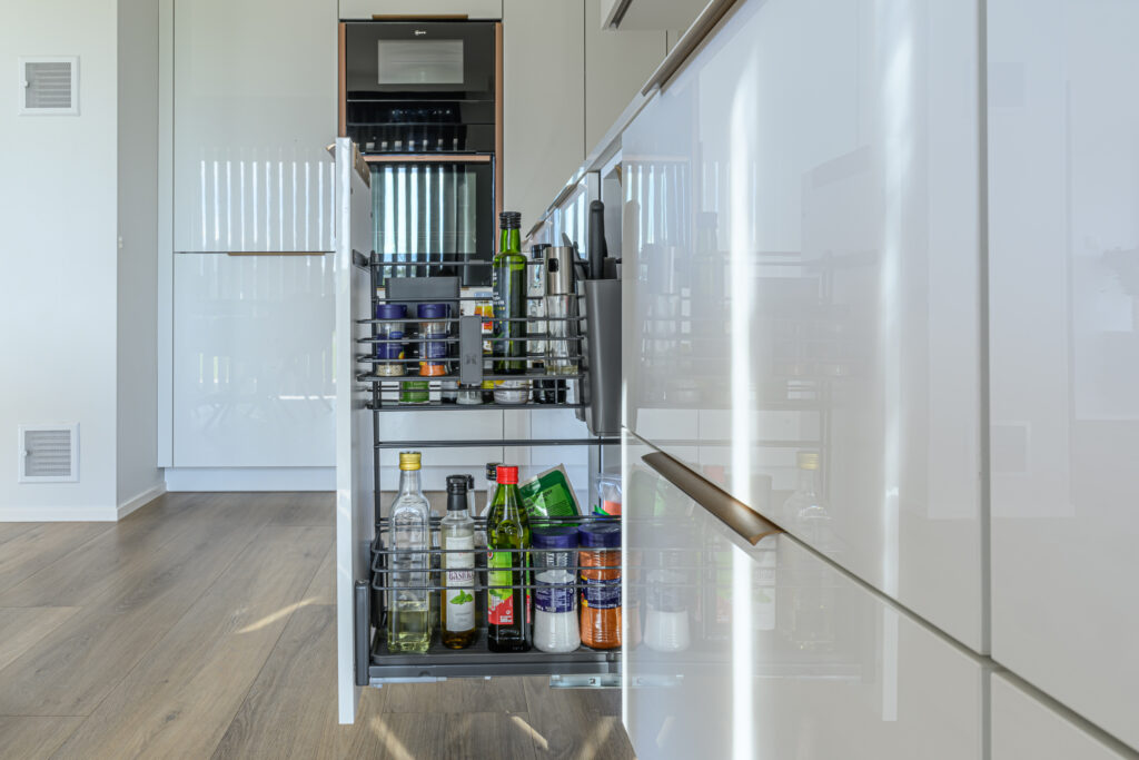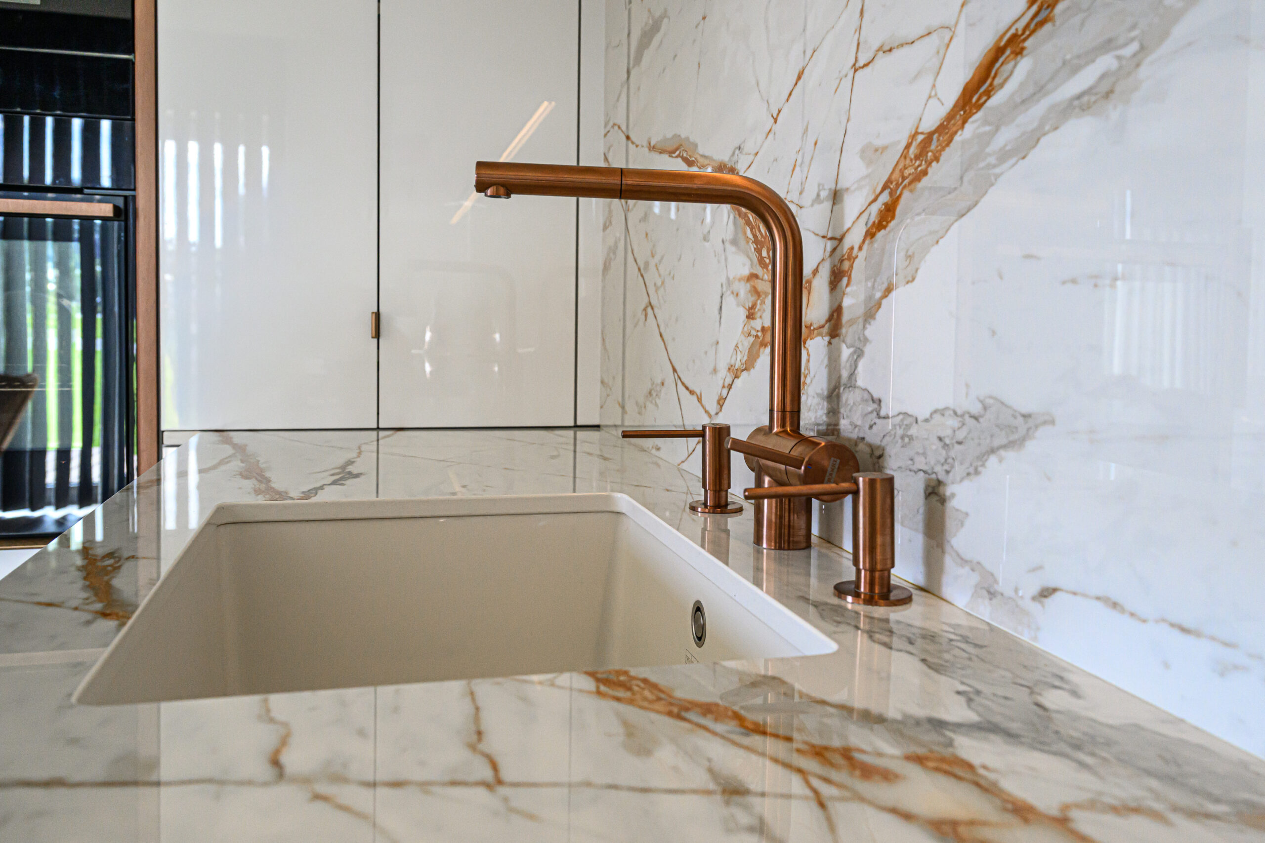 Siin näete ühte armast kodu Viljandimaal, kuhu valmistasime heledates värvitoonides köögi ja TV-kapi lahenduse. Kuna tegemist on avatud elutoaga, siis kasutasime nii köögis kui ka TV-kapi lahenduses valget kõrgläiket, mis loob kauni ühtse tulemuse. Köögi töötasapinnaks on jõuliste veenidega Dekton Awake kivi Cosentinolt. Ruumi viimistlevad kaunilt üheks tervikuks pronksjad detailid – käepidemed, ahju liistud ja sanitaartehnika. Tehnikasett on valitud Saksa tootjalt Neffilt. Kivi värvitoonidest inspireerituna on sarnastes värvides tellitud ka Riviera Maisoni toolid ja Dan-Formi laud, mida saab samuti tellida Schmidtist. Kuna kodu omanikud on suured kokkajad, on iga detail köögis hoolikalt läbi mõeldus, et see oleks võimalikult praktiline ja mugav kasutada.