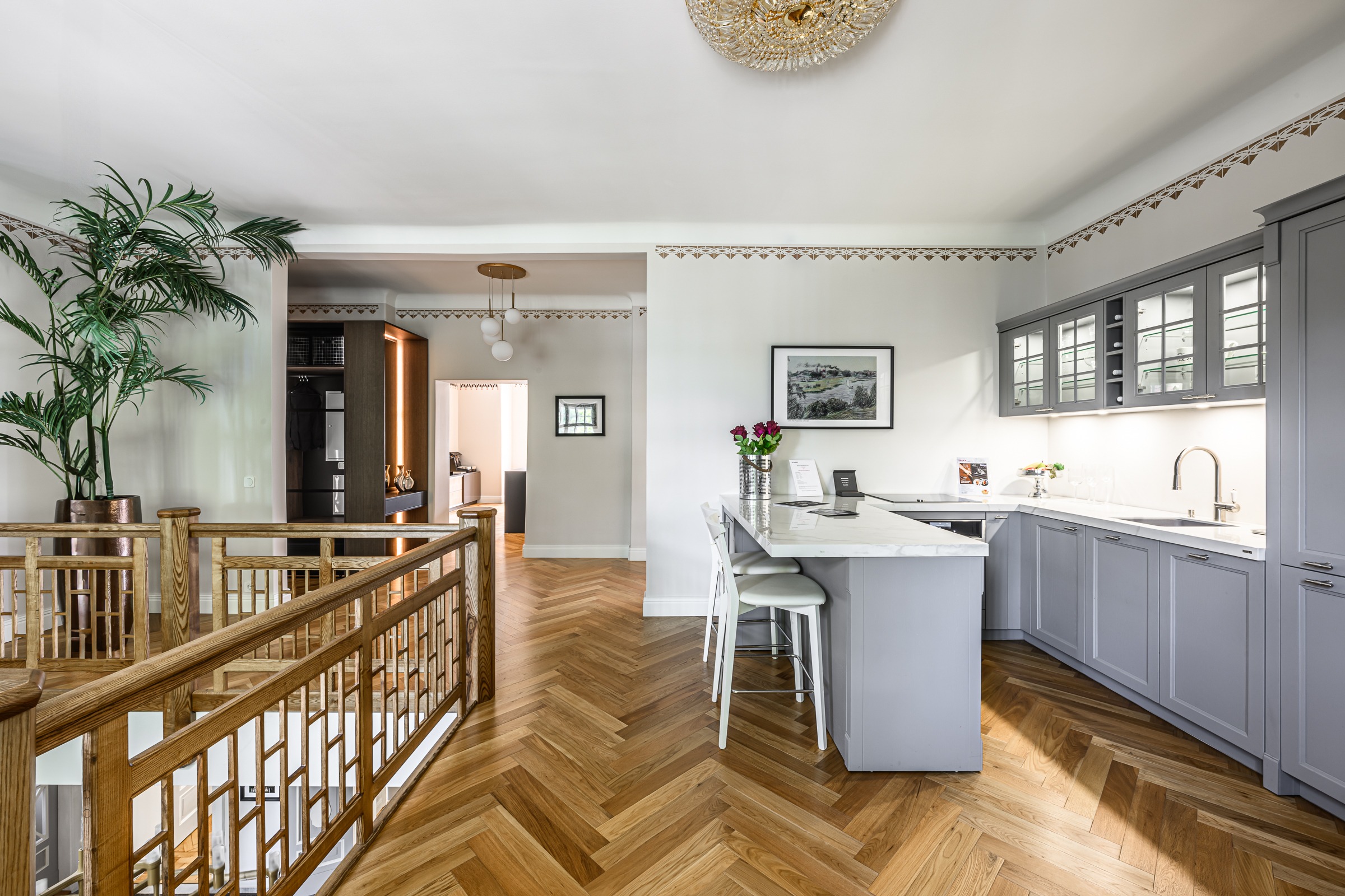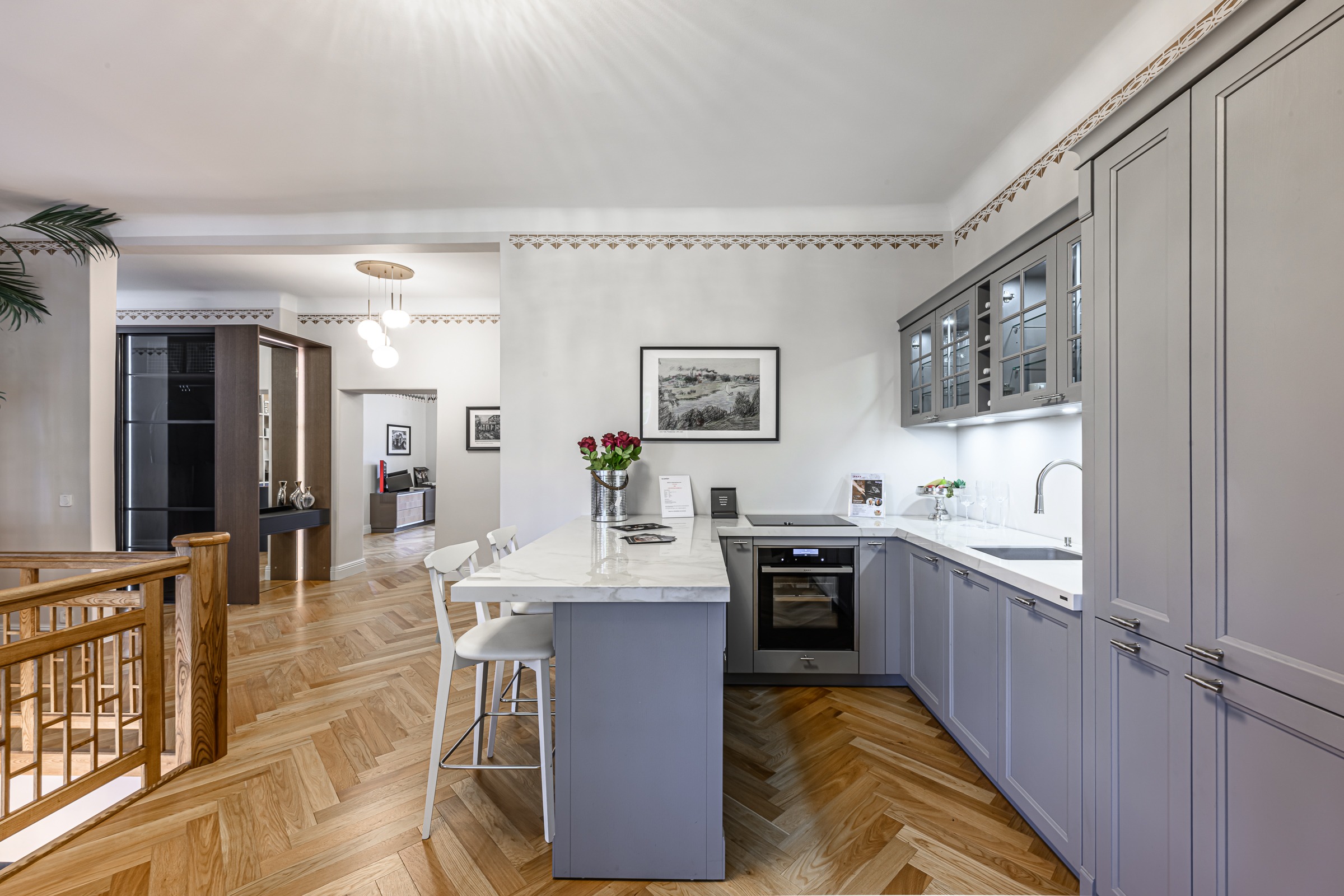 Siin on suurepärane näide sellest, kuidas on võimalik meie salongi näidiskööki sobitada täiesti teise ruumi. Siin näete esialgset lahendust meie salongis ning allpool sama kööki kliendi kodus.
