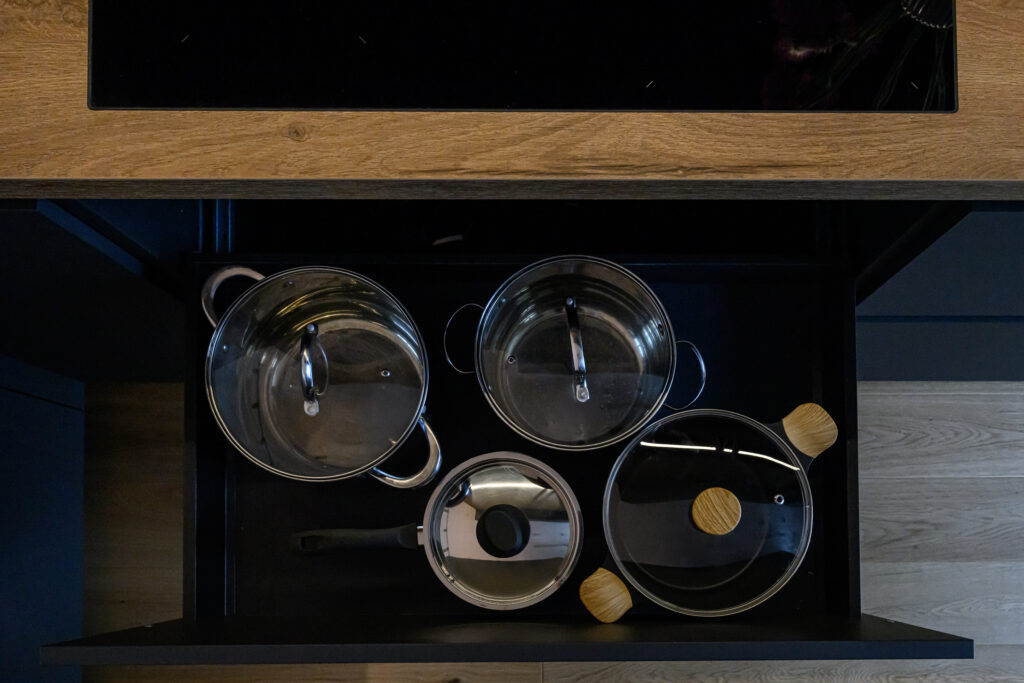 Köögis on põhitooniks sametise nano kattega tumehall Caneo, millele on kõrvale toodud naturaalsest spoonist valmistatud ülemised kapid viimistlusega Alabama. Need avanevad mugavalt lõõtsana ülesse ning kappide alla lisasime hubase LED valgustuse. Köögi tasapind on tehtud standardist sügavam, 650mm, mistõttu oleme all kasutatud ka ekstrasügavaid sahtleid. Need annavad juurde nii tööpinda- kui ka hoiustusruumi. Tasapinnaks on sama viimistlus Alabama nagu ka ülemistel kappidel ning laminaadi sisse on uputatud kvaliteetne Bora pliidiplaat. Kööki on lisatud ka suurepärane abimees – väljatõmmatav täispikkuses cargo kapp, mis on suurepäraseks lahenduseks kuivainete hoiustamiseks, pakkudes samal ajal ka head ülevaadet kapi sisust.