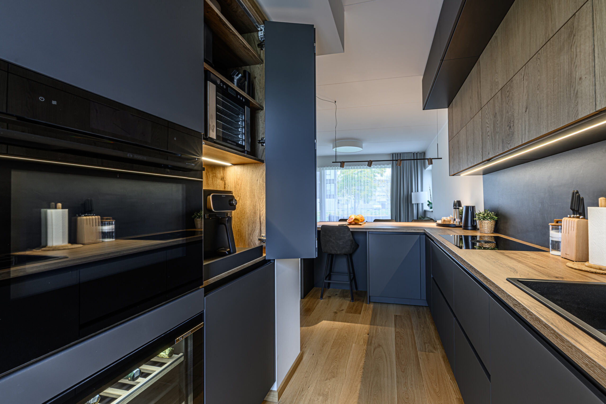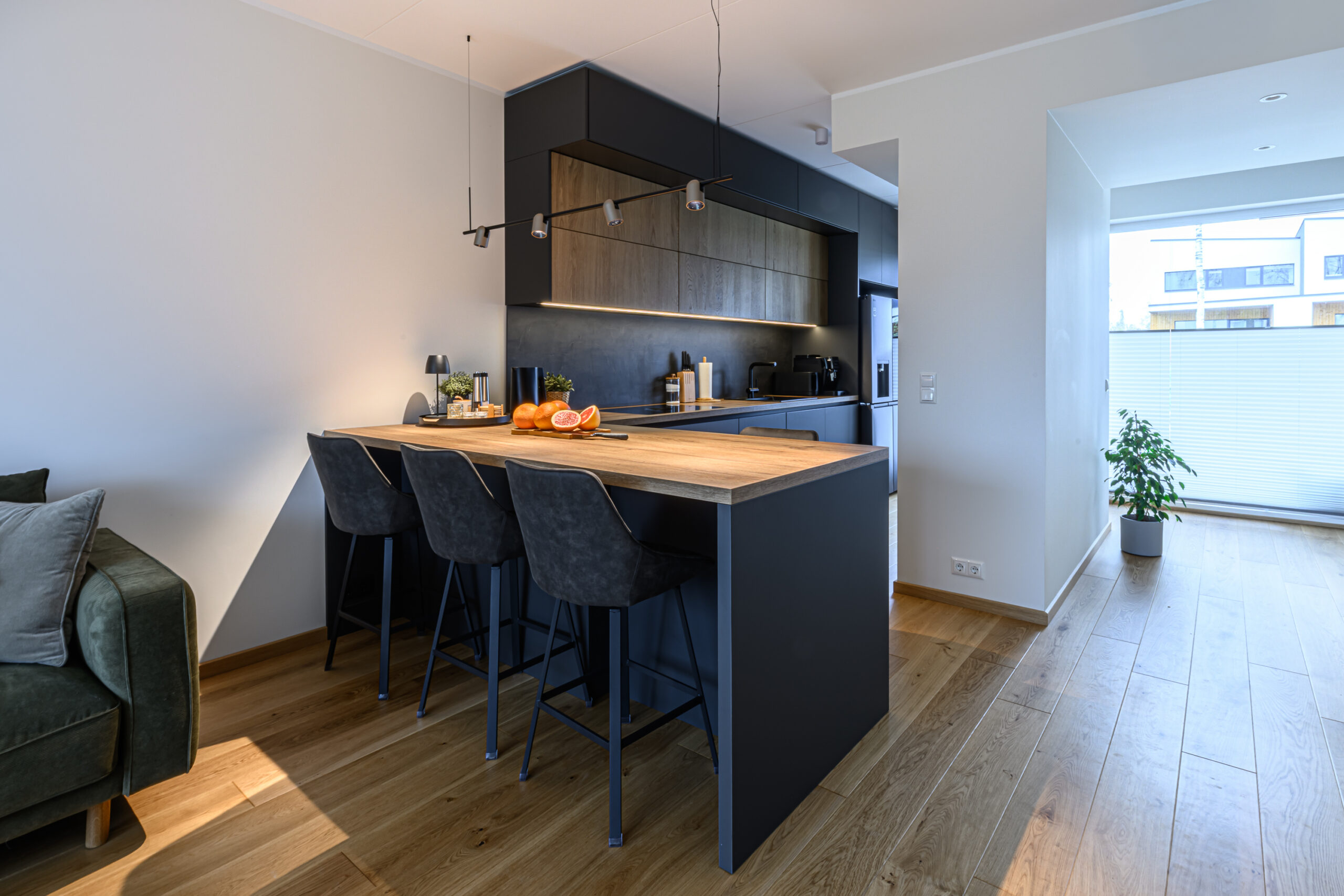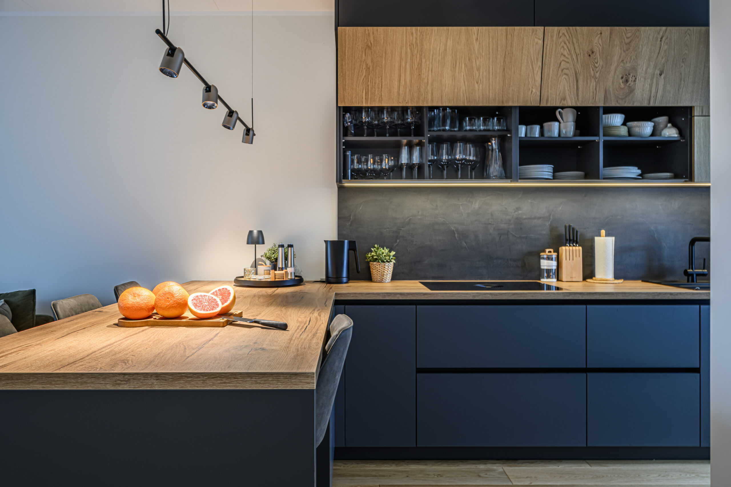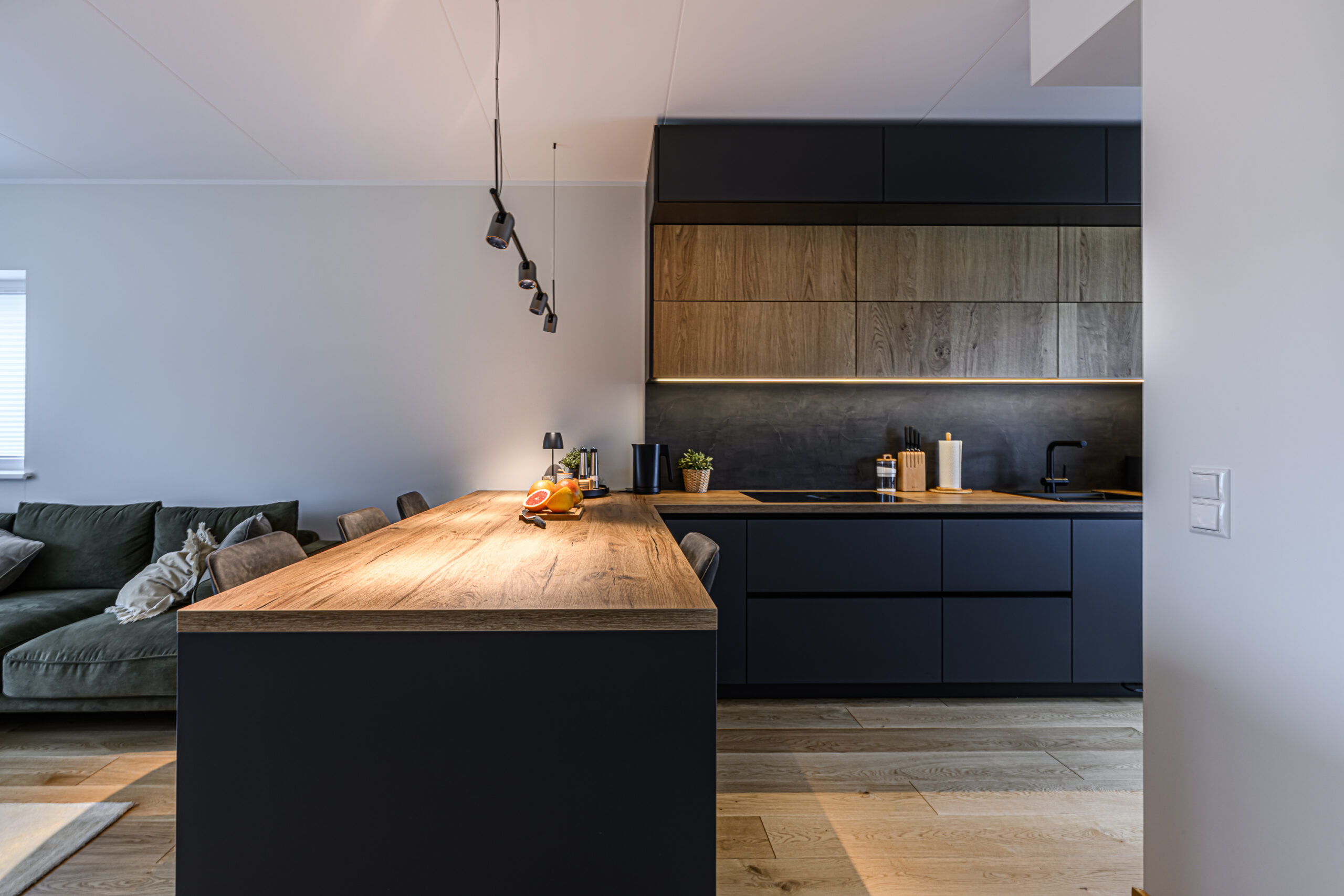 Köögis on põhitooniks sametise nano kattega tumehall Caneo, millele on kõrvale toodud naturaalsest spoonist valmistatud ülemised kapid viimistlusega Alabama. Need avanevad mugavalt lõõtsana ülesse ning kappide alla lisasime hubase LED valgustuse. Köögi tasapind on tehtud standardist sügavam, 650mm, mistõttu oleme all kasutatud ka ekstrasügavaid sahtleid. Need annavad juurde nii tööpinda- kui ka hoiustusruumi. Tasapinnaks on sama viimistlus Alabama nagu ka ülemistel kappidel ning laminaadi sisse on uputatud kvaliteetne Bora pliidiplaat. Kööki on lisatud ka suurepärane abimees – väljatõmmatav täispikkuses cargo kapp, mis on suurepäraseks lahenduseks kuivainete hoiustamiseks, pakkudes samal ajal ka head ülevaadet kapi sisust.