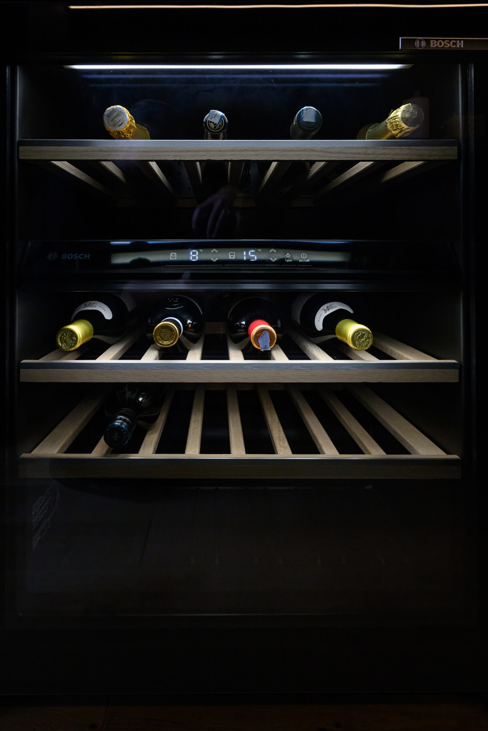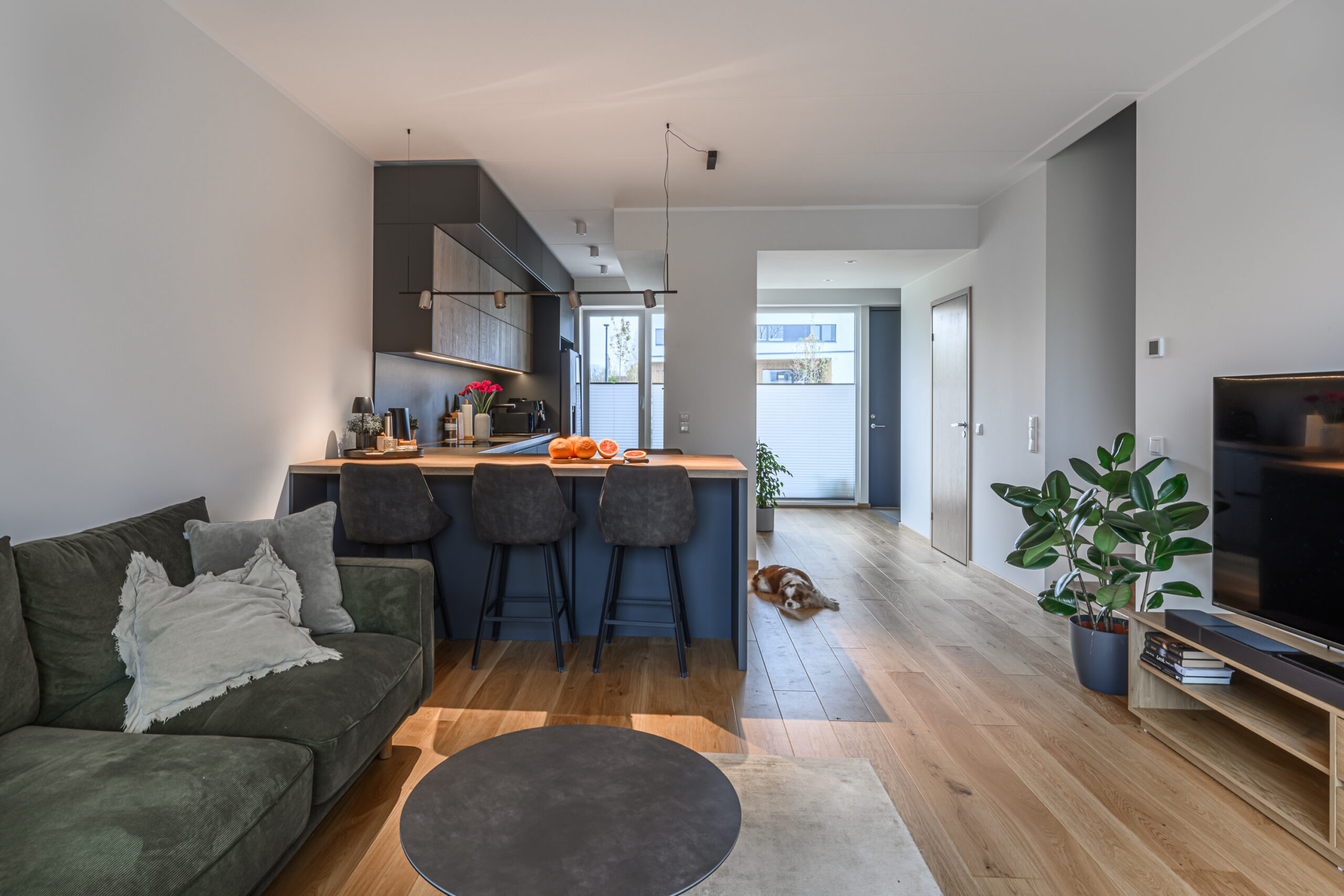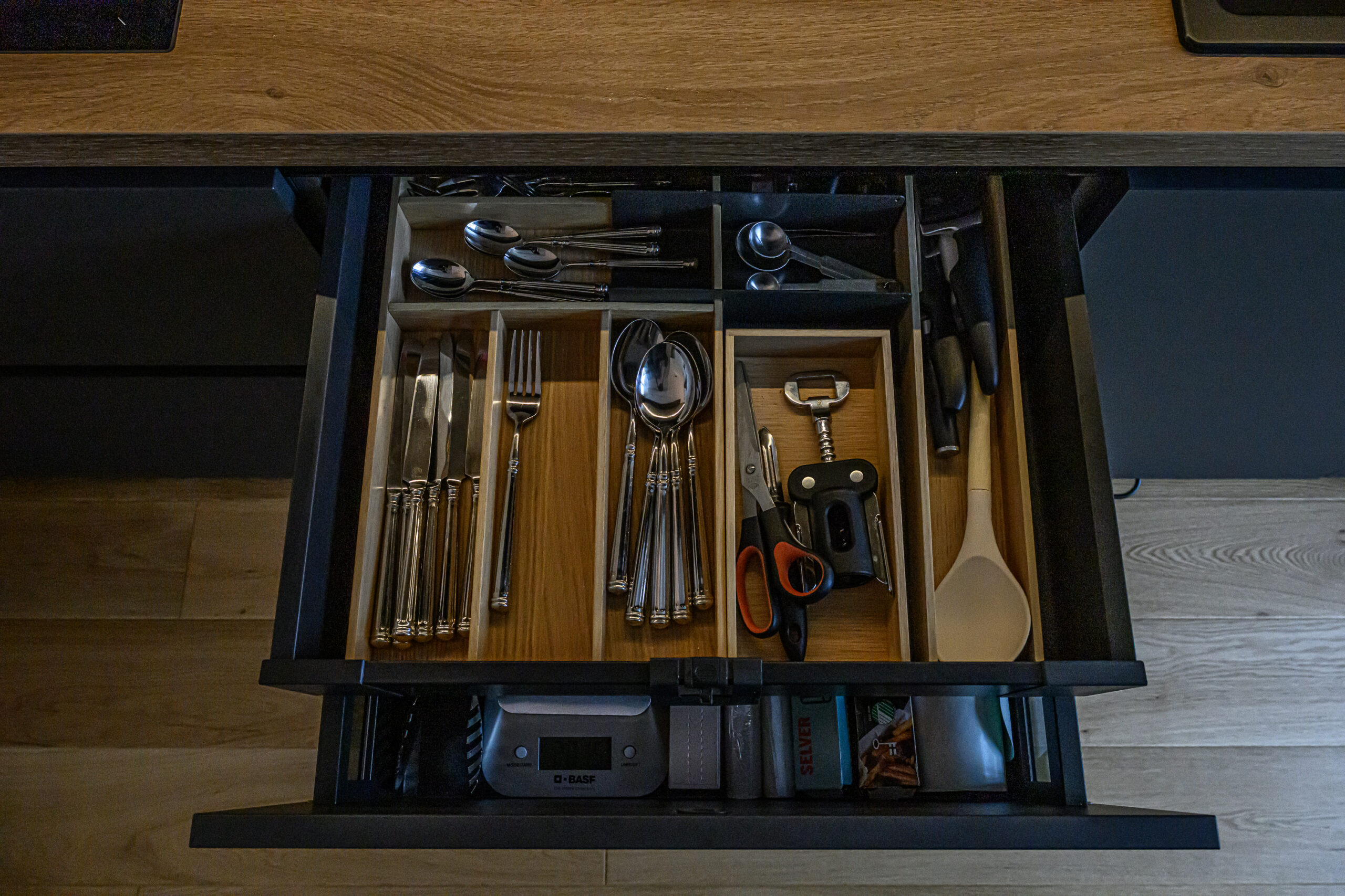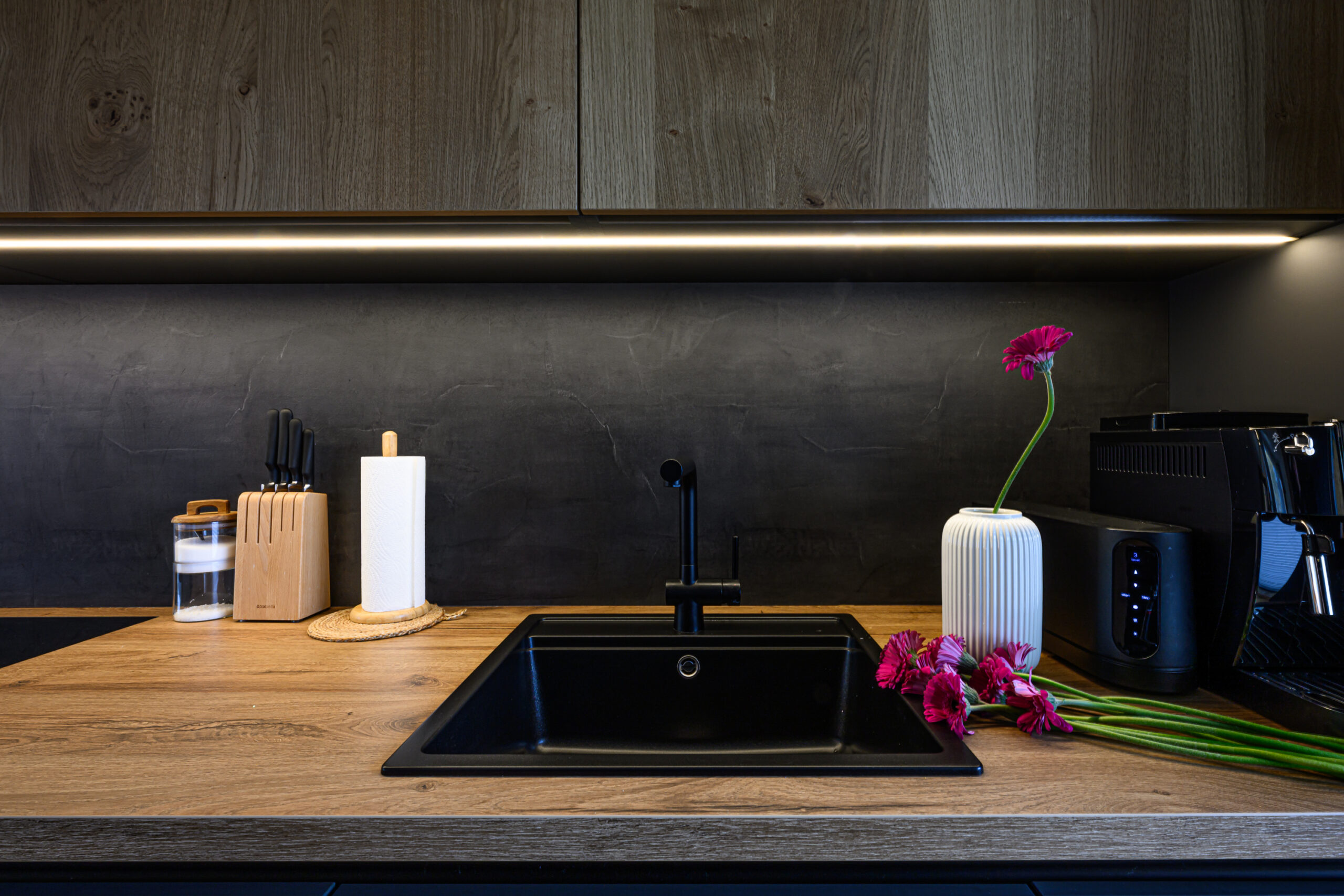 Köögis on põhitooniks sametise nano kattega tumehall Caneo, millele on kõrvale toodud naturaalsest spoonist valmistatud ülemised kapid viimistlusega Alabama. Need avanevad mugavalt lõõtsana ülesse ning kappide alla lisasime hubase LED valgustuse. Köögi tasapind on tehtud standardist sügavam, 650mm, mistõttu oleme all kasutatud ka ekstrasügavaid sahtleid. Need annavad juurde nii tööpinda- kui ka hoiustusruumi. Tasapinnaks on sama viimistlus Alabama nagu ka ülemistel kappidel ning laminaadi sisse on uputatud kvaliteetne Bora pliidiplaat. Kööki on lisatud ka suurepärane abimees – väljatõmmatav täispikkuses cargo kapp, mis on suurepäraseks lahenduseks kuivainete hoiustamiseks, pakkudes samal ajal ka head ülevaadet kapi sisust.