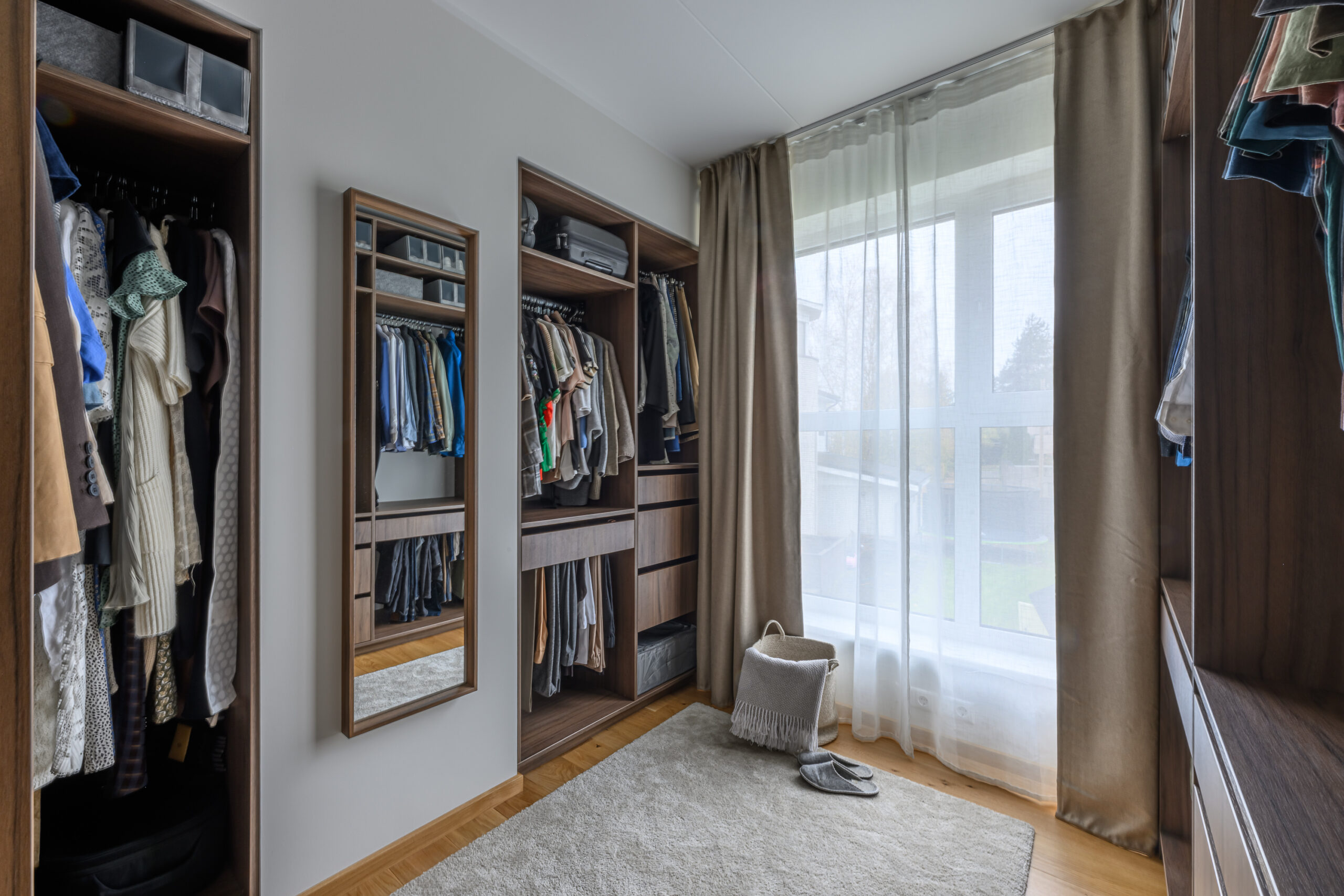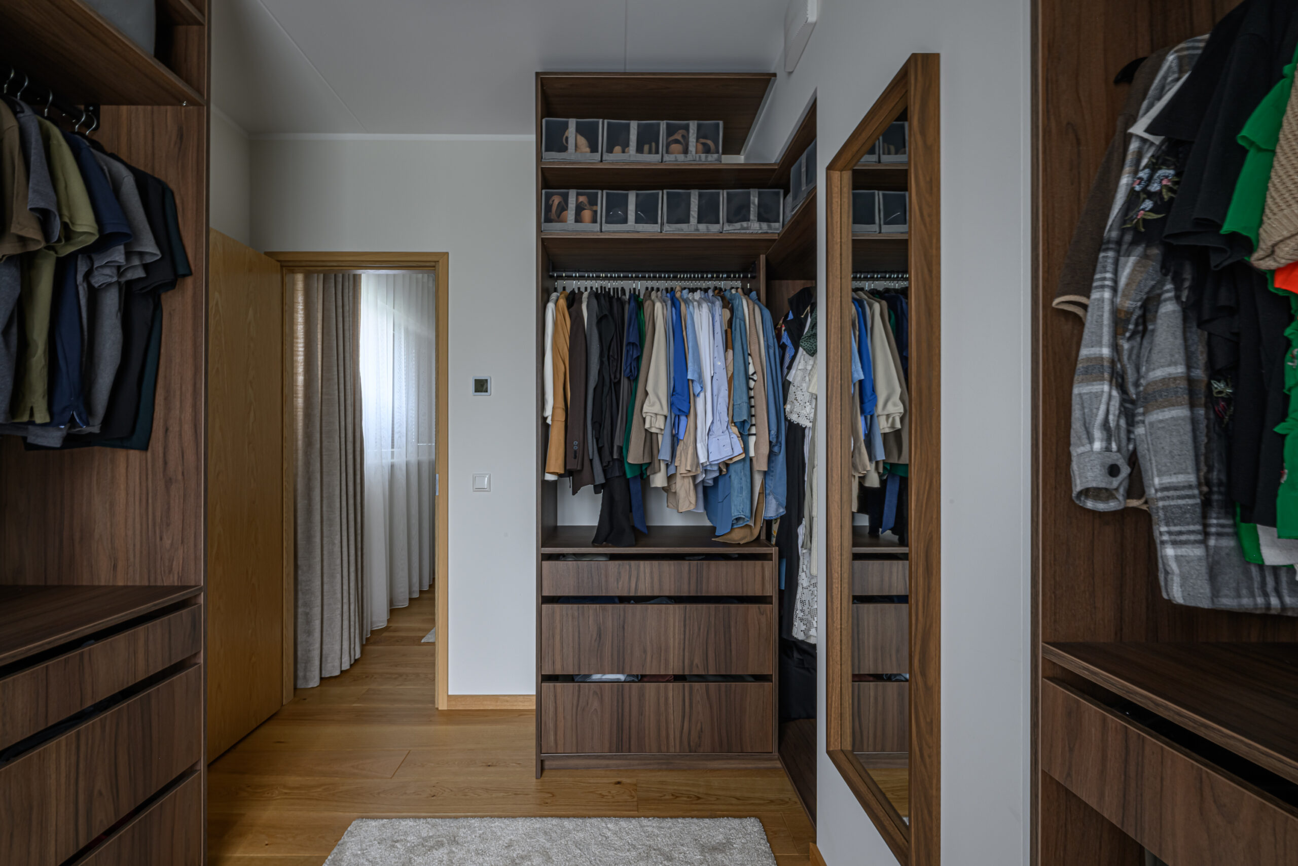 Walk-in garderoob asub suures ruumis ning on hoolikalt läbi mõeldud, et igale esemele oleks oma kindel koht. Materjaliks on siin 2025. aastal lisandunud puiduimitatsiooniga materjal Fox. Selleks, et tagada mööbli mugav kasutamine, on siia lisatud palju sahtleid, pükste sahtleid ja stangesid.