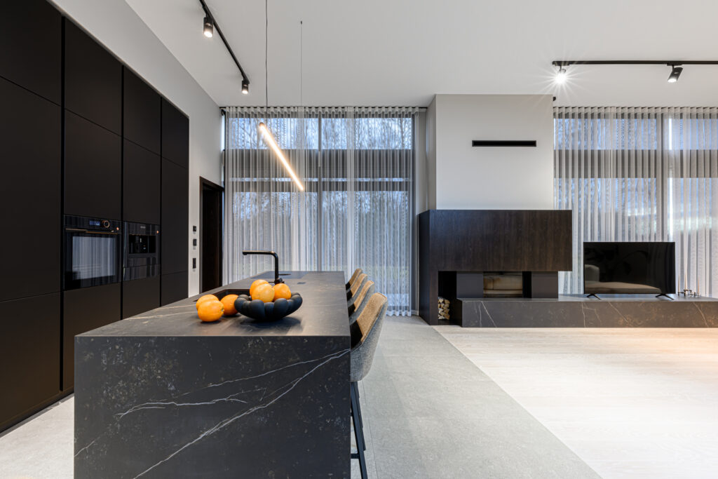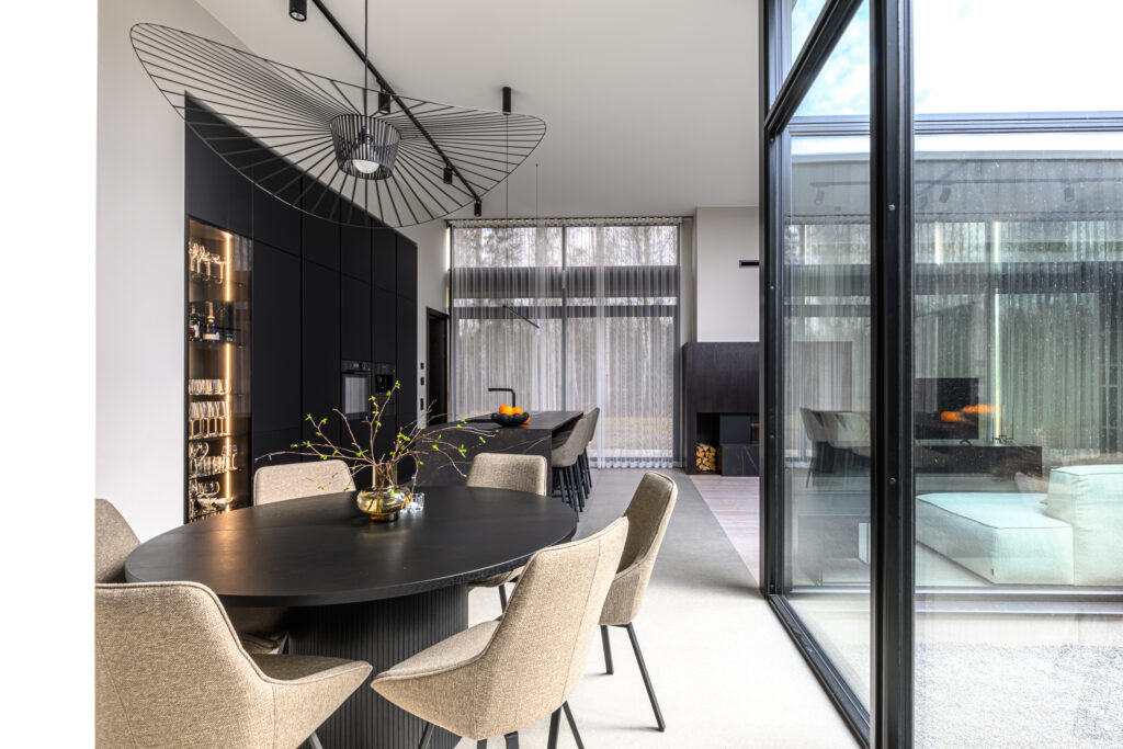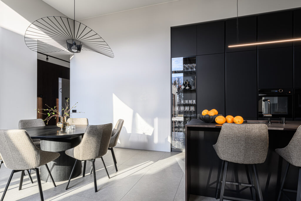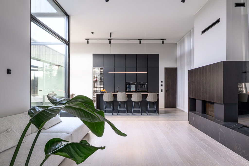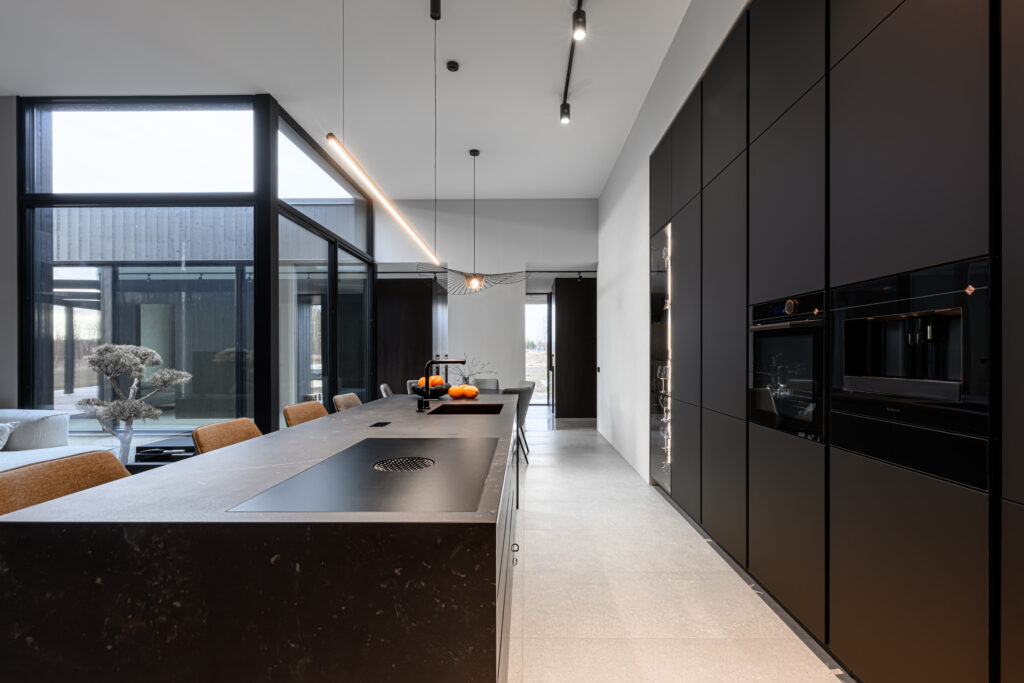 Schmidti mööblit võib leida igast Eestimaa nurgast. Siin näete ülimalt stiilset ja modernset kodu Põltsamaal. Schmidti poolt on siia valmistatud ülimalt minimalistlik must köök, mille uste materjaliks on sametineArcos Sweet Black. Töötasapinnaks on tumeda materjaliga imehästi sobiv Dekton Kelya Cosentinolt. Sama kuumakindlat kivi on kasutatud ka kaminal. Köögis näete veel Bora õhupuhastajaga pliidiplaati ja ülejäänud tehnika pärineb De Dietrichilt. Sanitaartehnika on valitud musta värvi tooted Blancolt.