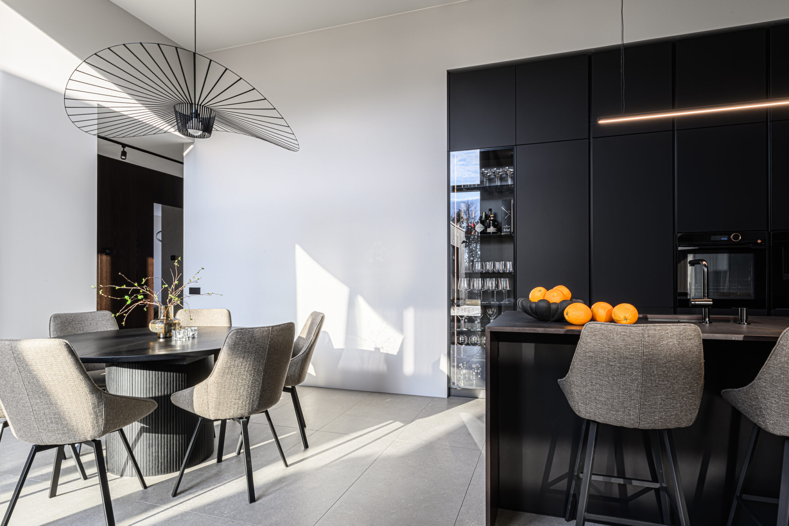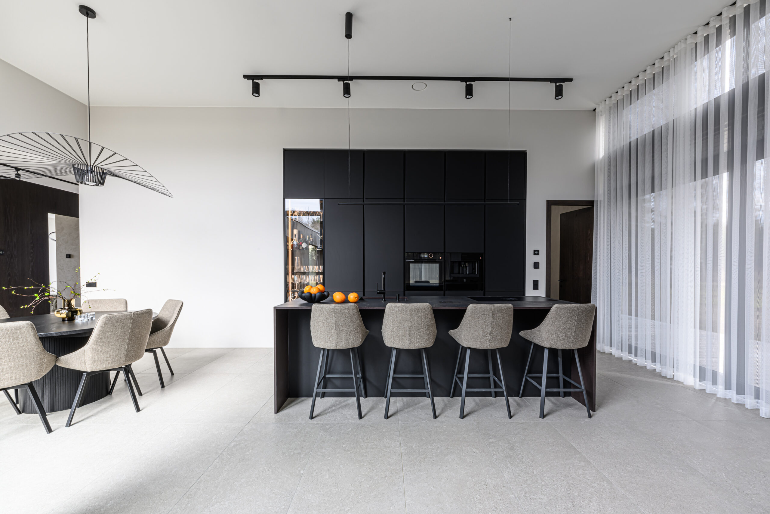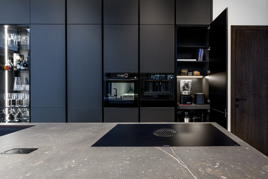 Schmidti mööblit võib leida igast Eestimaa nurgast. Siin näete ülimalt stiilset ja modernset kodu Põltsamaal. Schmidti poolt on siia valmistatud ülimalt minimalistlik must köök, mille uste materjaliks on sametineArcos Sweet Black. Töötasapinnaks on tumeda materjaliga imehästi sobiv Dekton Kelya Cosentinolt. Sama kuumakindlat kivi on kasutatud ka kaminal. Köögis näete veel Bora õhupuhastajaga pliidiplaati ja ülejäänud tehnika pärineb De Dietrichilt. Sanitaartehnika on valitud musta värvi tooted Blancolt.