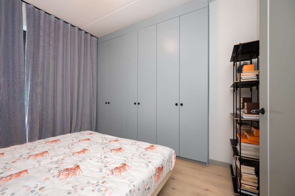 Magamistoa riiete kapi ja vannitoa kapi tegime sama värvitooniga Nordic Blue. Lisaks on mõlemas lahenduses (lisaks ka esikus) kasutatud armsaid ümmargusi käepidemeid, mis loovad ühtse käekirja läbi erinevate tubade. Vannituppa valmistasime suure valamukapi, et oleks piisavalt ruumi kõikide asjadega ära panemiseks. Kapi tasapind koos valamuga pärineb Baltecost.