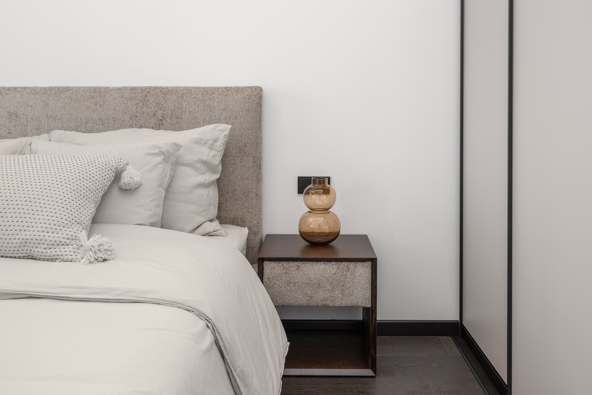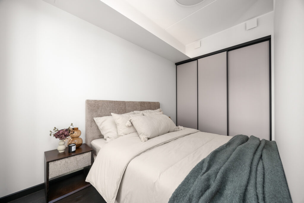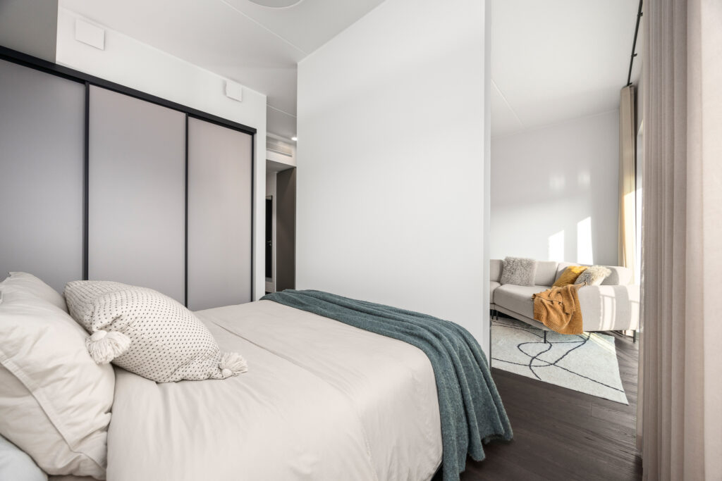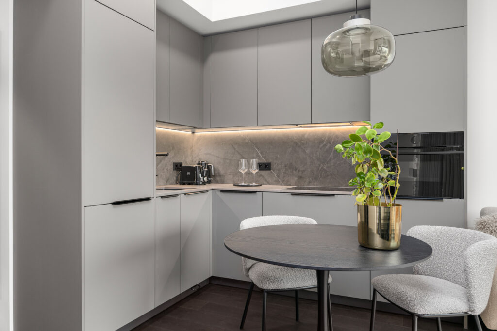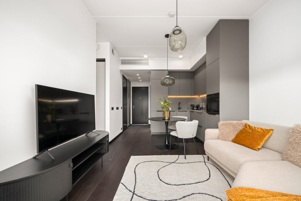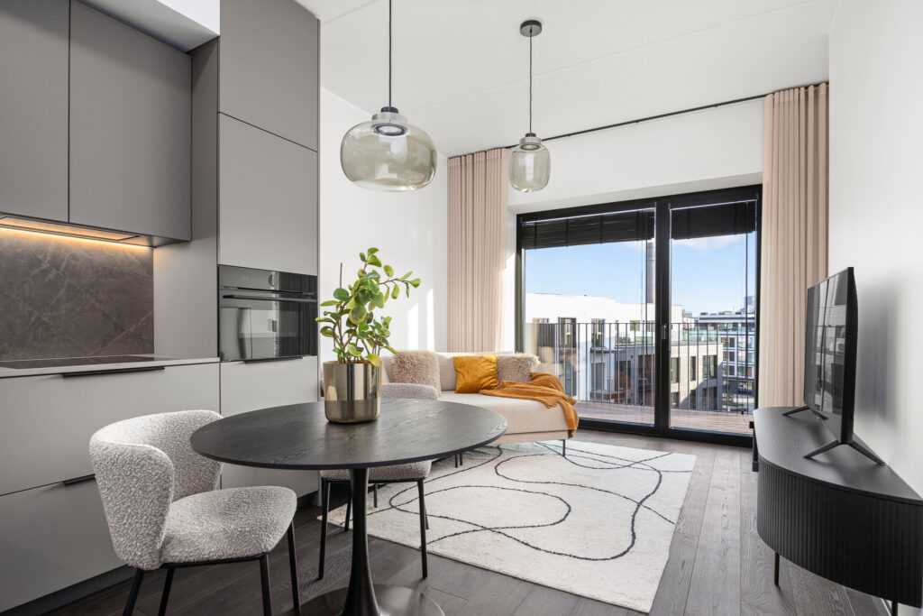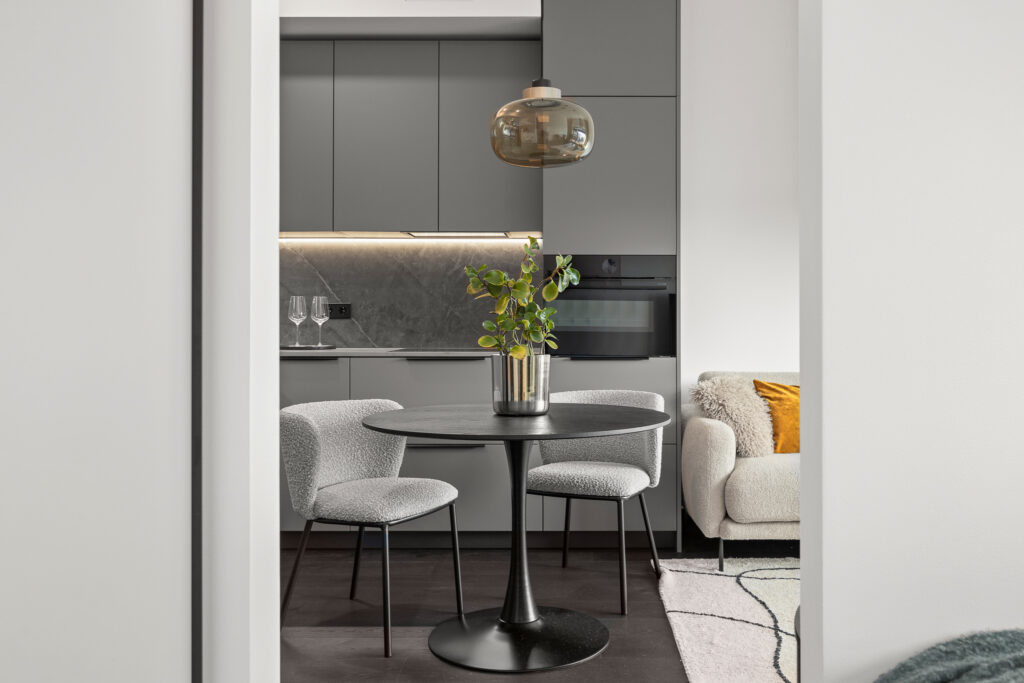 Kalaranna Kvartalis on valmis saanud üks väike, kuid ülimalt maitsekalt sisustatud korter. Nii köögimööbel kui ka magamistoa garderoob on tehtud sama materjaliga, melamiiniga Soft Claystone. Köögis on töötasapinnaks ja taustaks uste värviga kaunilt sobituv Dektoni kivi Kira. Kogu tehnikasett on valitud Boschi Accent Line’i sarjast. Garderoobi kapp on tehtud praktiliste lükandustega, mida raamivad kaunilt mustad ääred.
