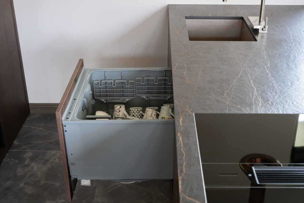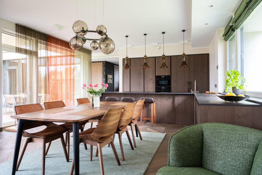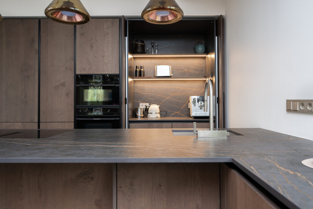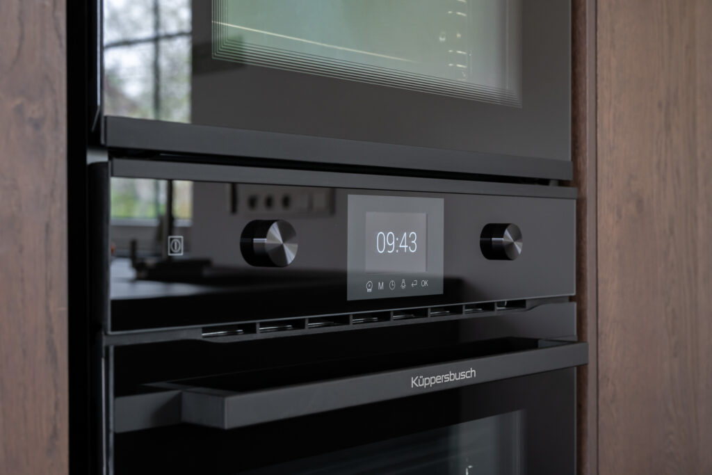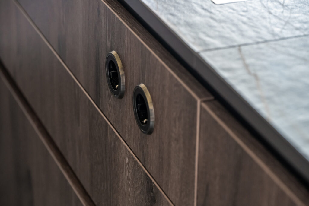 Loodusliku spooniga köök, mille saart katab imeilus Dektoni kivi Laurent. Tehnika on kokku pandud Küppersbuchilt ning lisaks näete siin ka Bora Classic õhupuhastajaga pliidiplaati ja pistikuid. Nõudeka sahtel pärineb Fisher & Paykelilt, segisti Hansgrohelt ja valamu Villeroy & Bochilt. Oleme siin kasutanud ka mugavat pocket-ustega kappi, mis on suurepärane koht väikemasinate hoiustamiseks.
