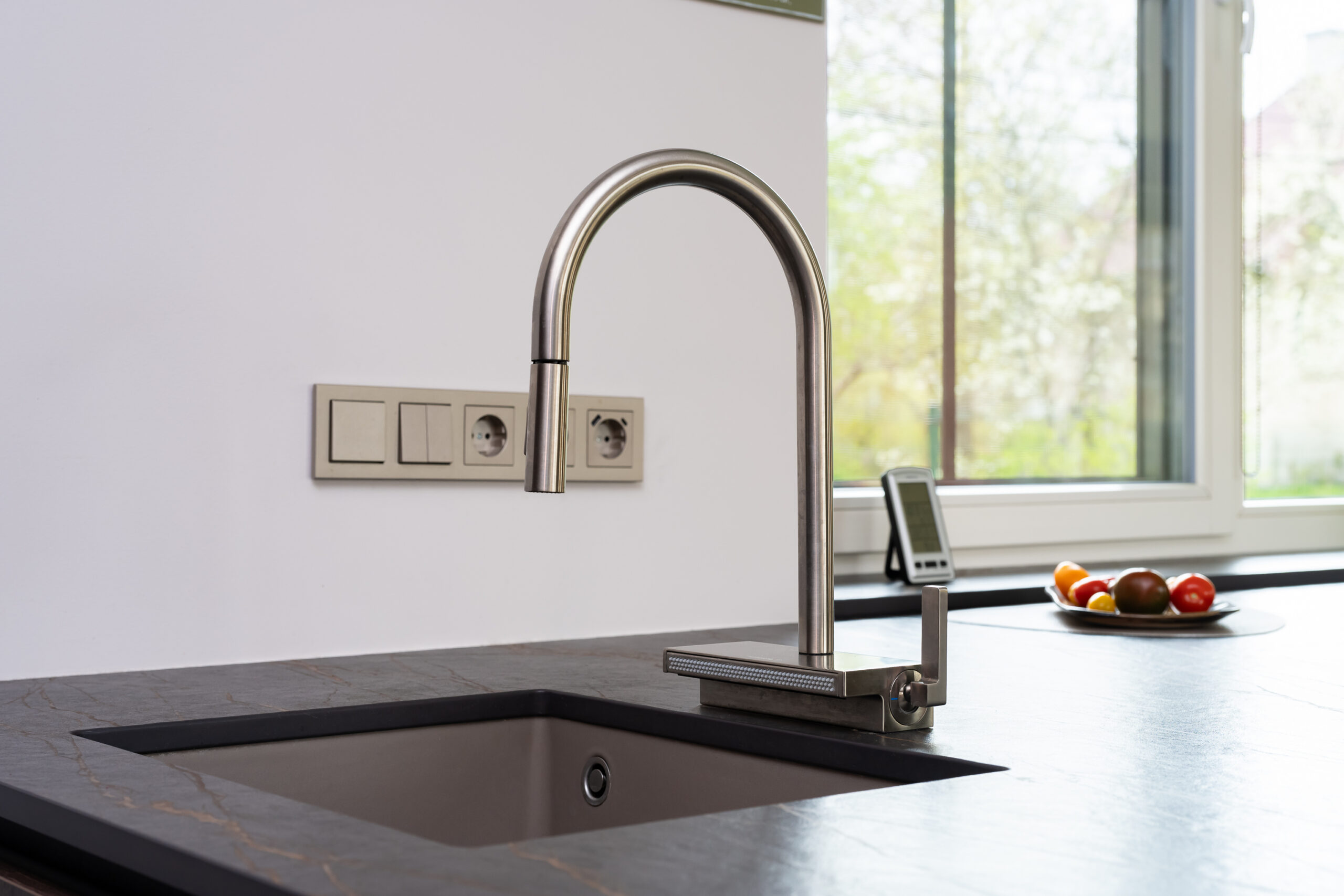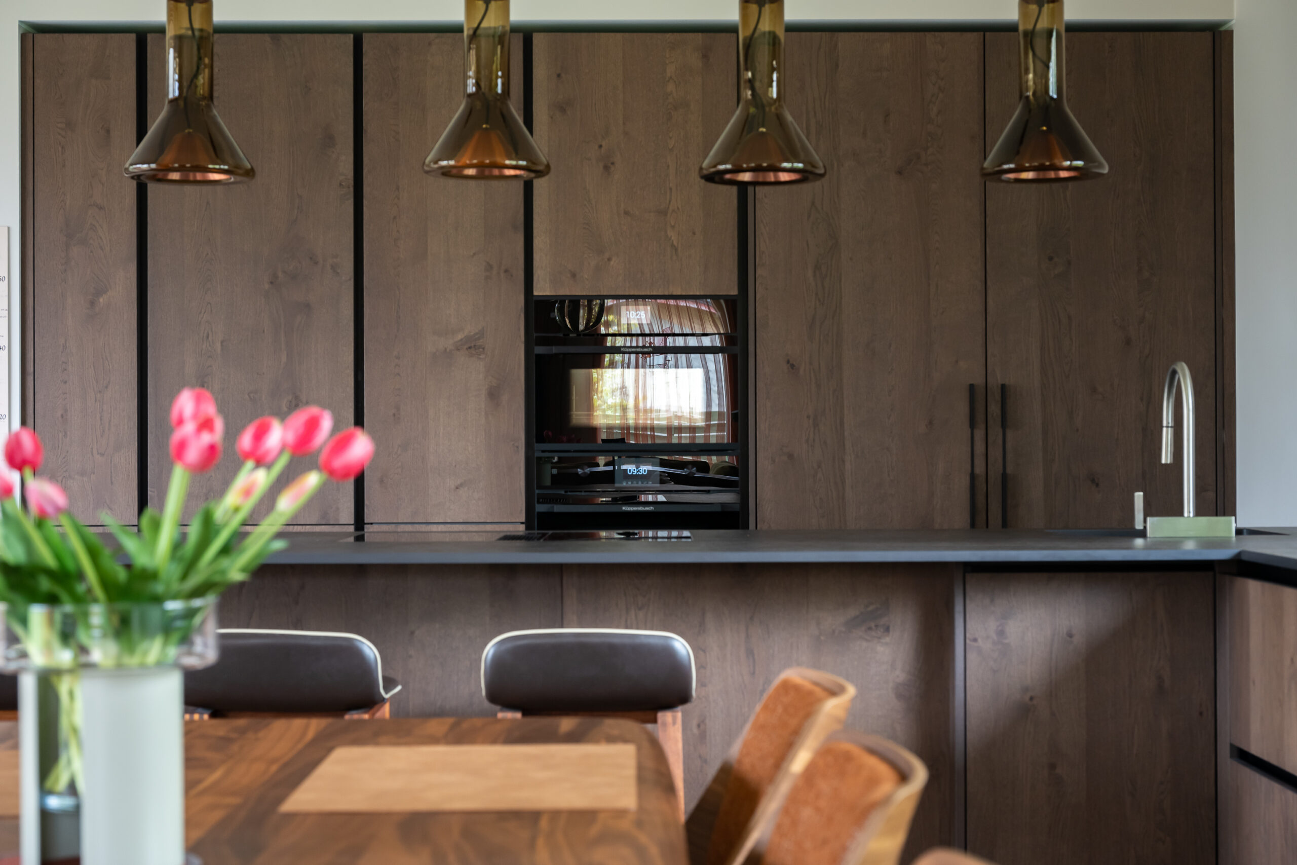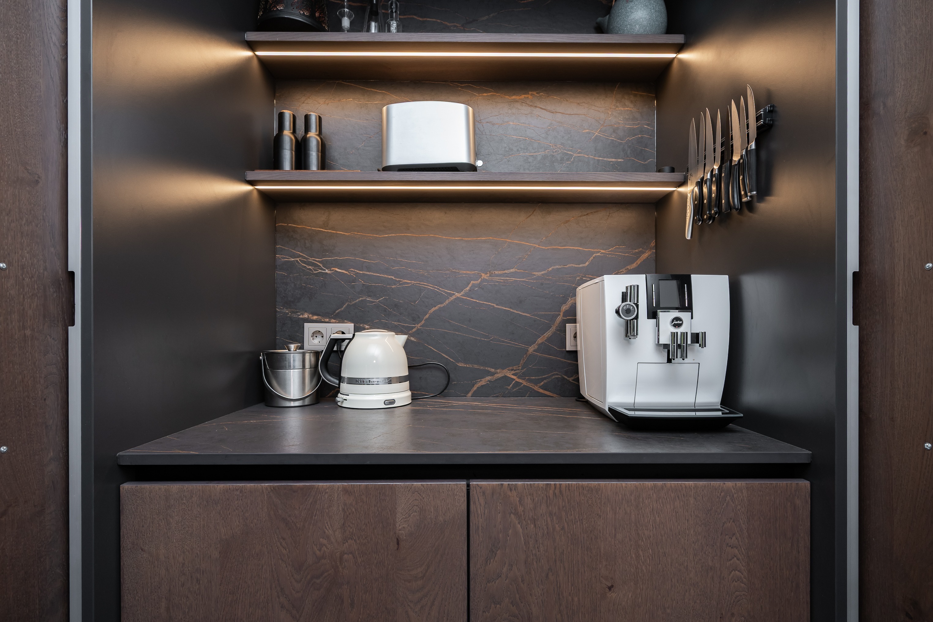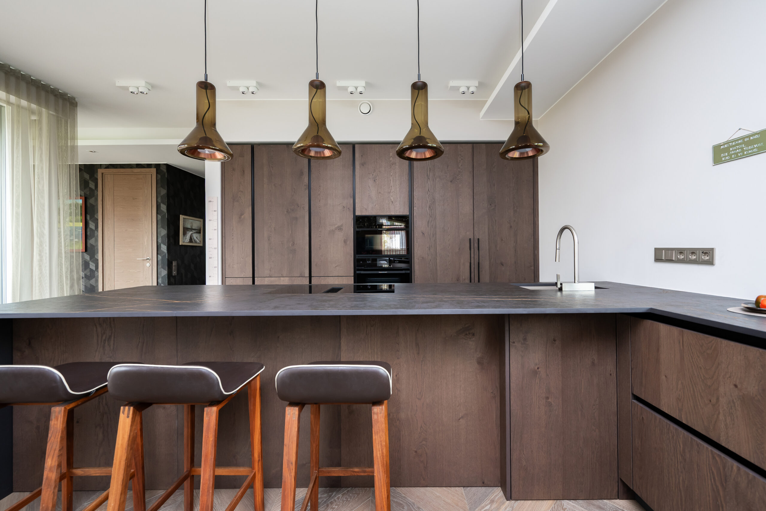 Loodusliku spooniga köök, mille saart katab imeilus Dektoni kivi Laurent. Tehnika on kokku pandud Küppersbuchilt ning lisaks näete siin ka Bora Classic õhupuhastajaga pliidiplaati ja pistikuid. Nõudeka sahtel pärineb Fisher & Paykelilt, segisti Hansgrohelt ja valamu Villeroy & Bochilt. Oleme siin kasutanud ka mugavat pocket-ustega kappi, mis on suurepärane koht väikemasinate hoiustamiseks.
